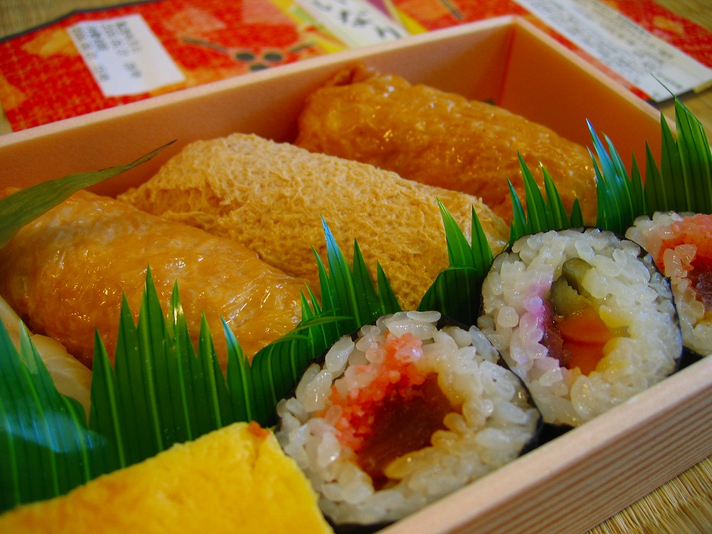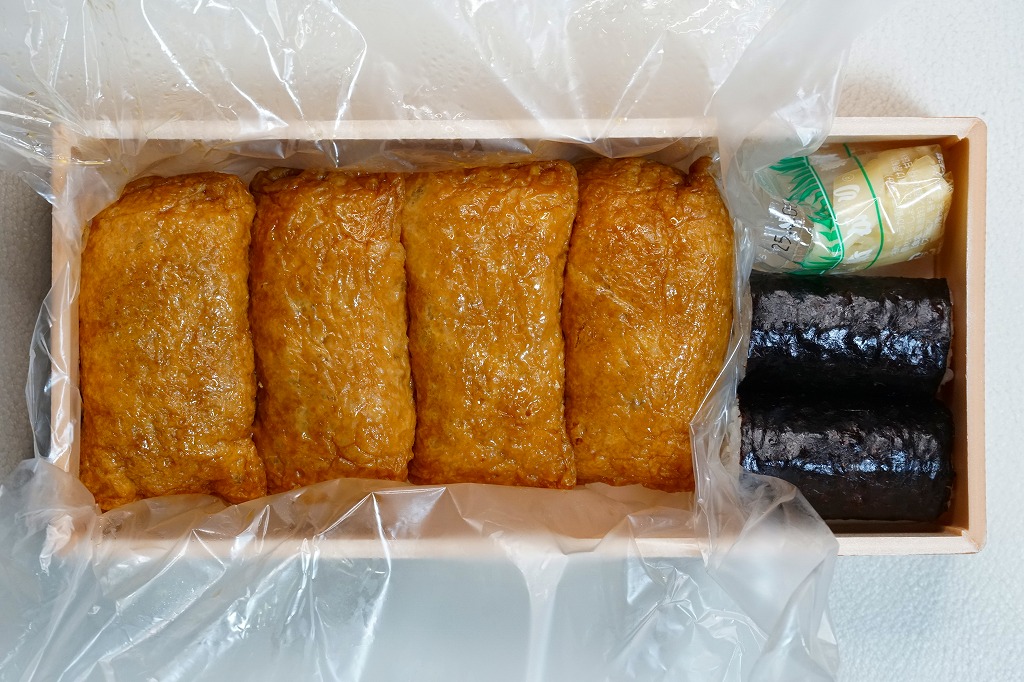 外観からはいなり寿司を想像するが、長方形の木製風紙容器に入るいなり寿司はふたつだけ。同じく太巻も海苔巻きと玉子巻きのふたつだけで、メインは実は細巻きである。2001年8月に上記の駅弁「いなりずし」へリニューアル。