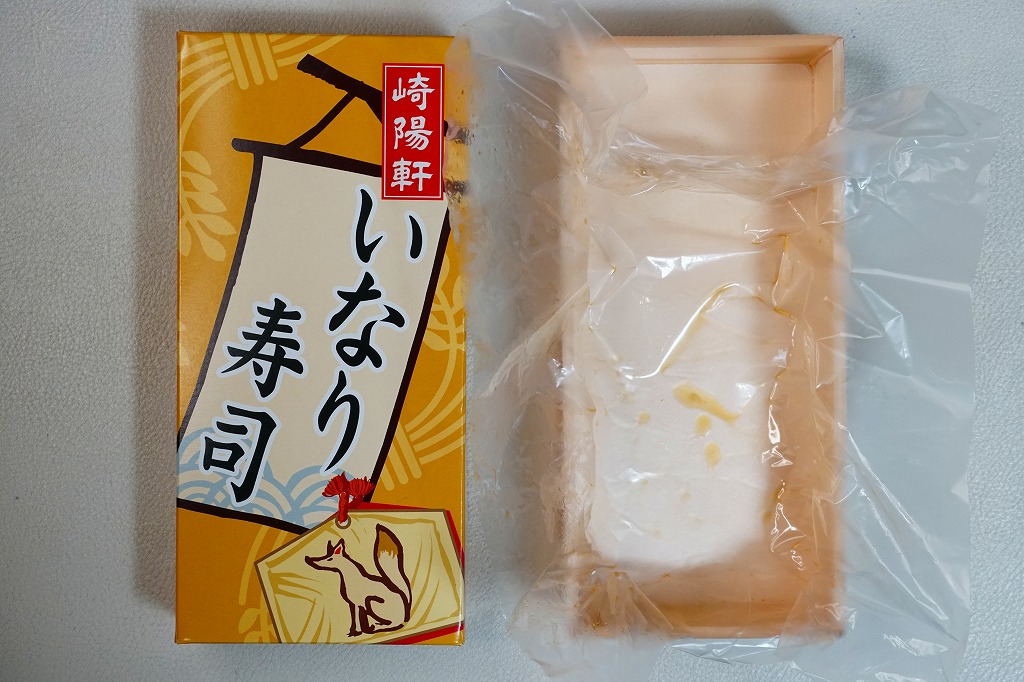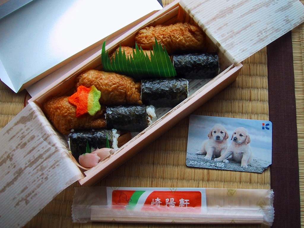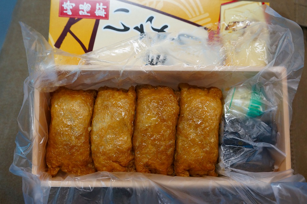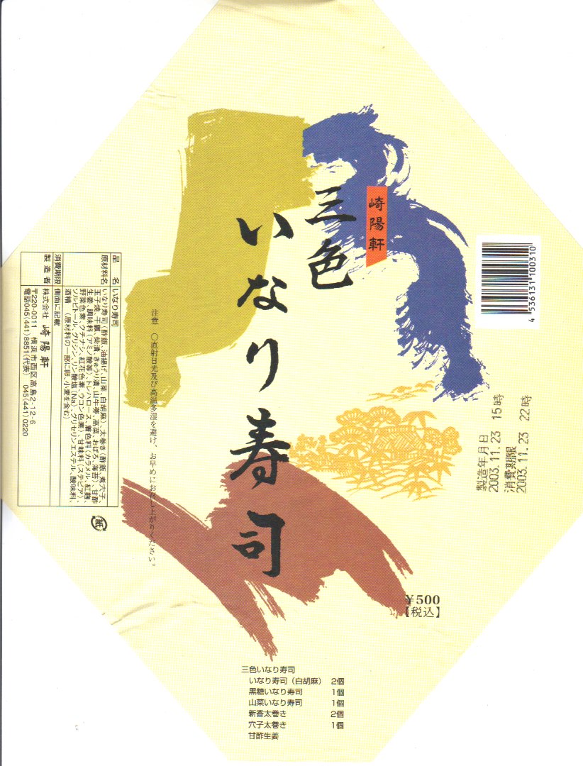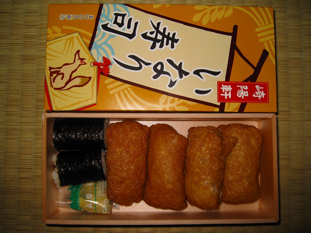 2001(平成13)年8月1日に従前の駅弁「太巻いなり寿司」をリニューアル。昭和40年代のものをデザインした掛紙をかける。いなり寿司が4個と、かんぴょうの細巻が4個で、駅弁の名前と中身が合ってきたが、ごわごわ感のあるいなり寿司など、食感や風味は東海道本線下り方面のいなり寿司駅弁には及ばず、シウマイや中華弁当の崎陽軒なので、餅は餅屋にという感じがしないでもない。2003年11月に上記の駅弁「三色いなり寿司」へリニューアル。