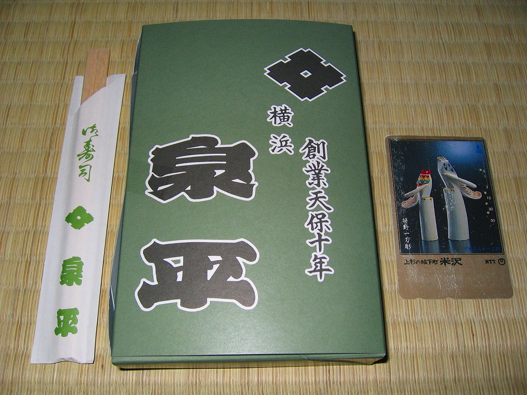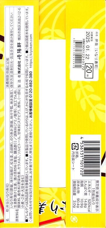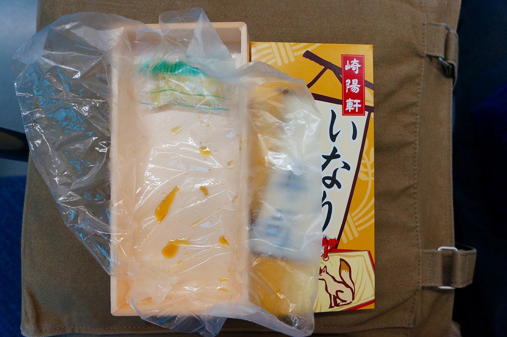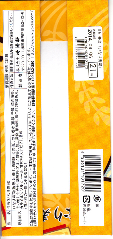 上記商品の別パッケージで、横浜駅北口改札内コンコースの弁当売店で購入。食品表示ラベルの商品名「いなりのり弁当」のとおり、泉平名物のいなりずしに加えて、かんぴょう巻きが4個入っている。こうやって地元の名物が駅の改札内で毎日買えるのであれば、駅弁と見なして良いと思う。