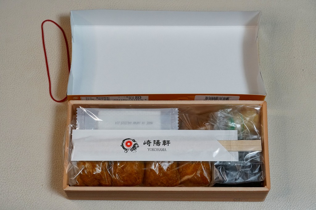 創業1839(天保10)年という横浜屈指の老舗の寿司屋の、昔からのハマっ子ならば誰もが知ってるいなりずし。うぐいす色の紙箱にいなりずしが何本か入っている。味もさることながらその色艶の美しさは日本一級だと思う。駅構内では買えないと思うが、関内尾上町(おのえちょう)の本店の他に、市内の百貨店や横浜スタジアムなどで販売されている。