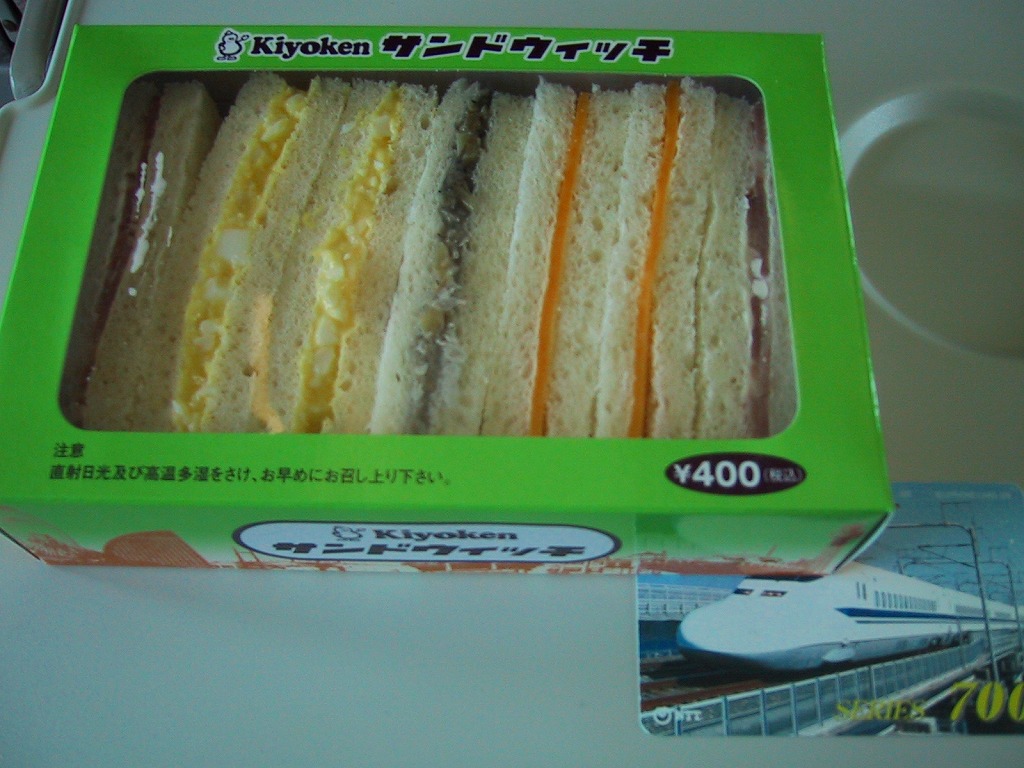 サンドイッチだけ入っていると思い購入すると、ツナ・玉子・カツのサンドがふたつづつに加え、唐揚げ・ポテト・しめじパスタにミニトマトやパイナップルも入る、食べ飽きない構成にうれしかった。サンドイッチ6切れだけで700円も取る東海道新幹線の車販サンドよりこちらを買いたいが、昼以降はたいてい売り切れている。2002年4月19日におかずのない「サンドウィッチ」(400円)に置き換えられた。