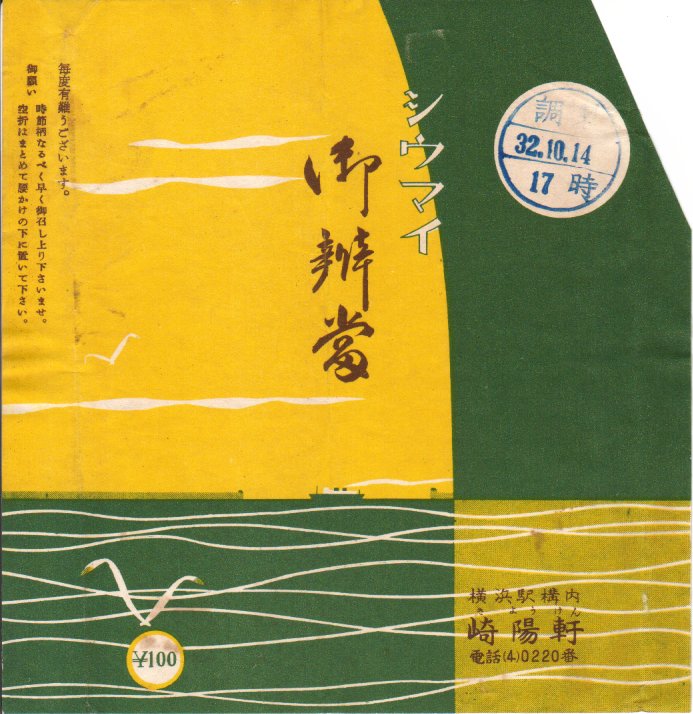 1957(昭和32)年10月14日(月)17時の調製と思われる、昔の横浜駅弁の掛紙。絵柄は上のものと同じ。「空折はまとめて腰かけの下に置いて下さい。」の注意書きに時代を感じる。当時の汽車や映画館などでは、客がごみを散らかさないよう、座席の下に置くことを呼び掛けていた。ごみ箱に入れろとするのはもう20年くらい後、持ち帰れとするのはさらに20年くらい後のこと。