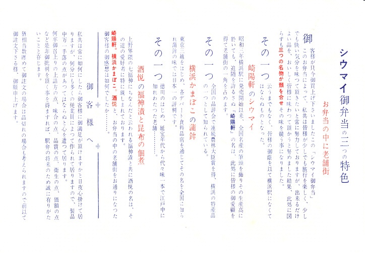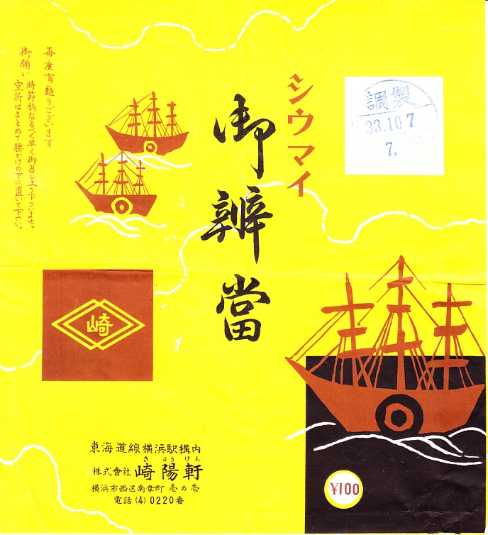 1958(昭和33)年10月7日(火)7時の調製と思われる、昔の横浜駅弁の掛紙。今も有名なシウマイ弁当。シウマイ弁当の掛紙の絵柄は現在までに3回変わったとされるが、この絵柄は1960年からの2代目でも1964年からの3代目でもない。こうなった由来を知りたいと思う。発売時のシウマイ弁当にはしおり「シウマイ御弁当の三つの特色」が添付されたらしく、シウマイ以外に特徴があったことがわかる。