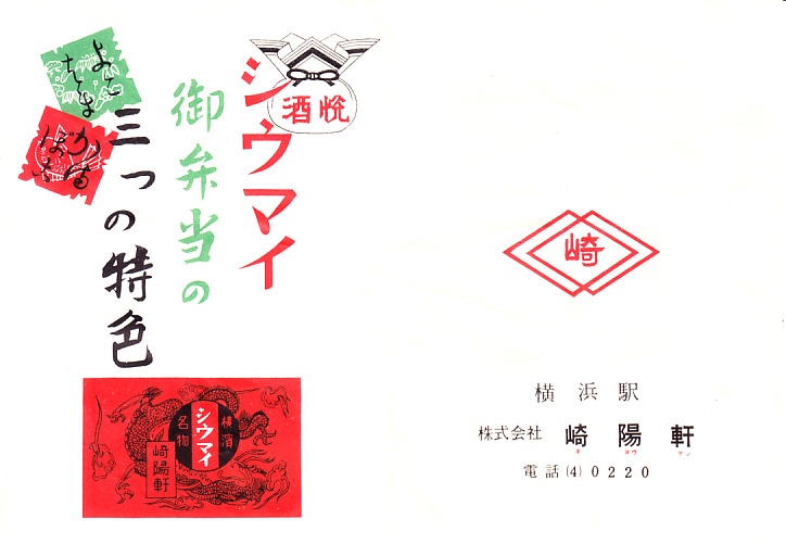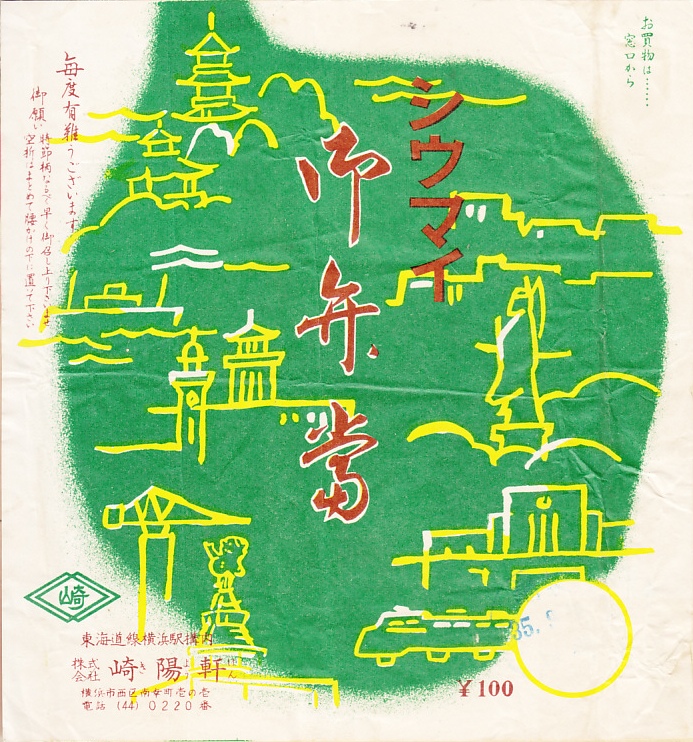 1960(昭和35)年9月不明日の調製と思われる、昔の横浜駅弁の掛紙。この年から1964(昭和39)年まで使われた、2代目のシウマイ弁当の掛紙。上に本牧の三渓園旧燈明寺三重塔と八聖殿、左に港の船に神奈川県庁と開港記念会館、右に横浜市街に掃部山(かもんやま)の井伊直弼像、右下に横浜駅東口駅舎と国鉄の特別急行電車、左下に港のクレーンと調製元本社のシウマイショップを描く。2代目の掛紙はあまり残されていない感じで、初代や3代目以降より見る機会が少ないと思う。崎陽軒の弁当の調製所は、1933(昭和8)年3月から1963(昭和38)年5月まで、東急東横線の高架下にあり、その住所が掛紙に記される。