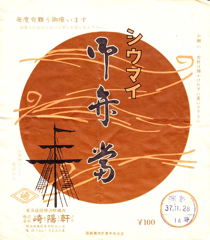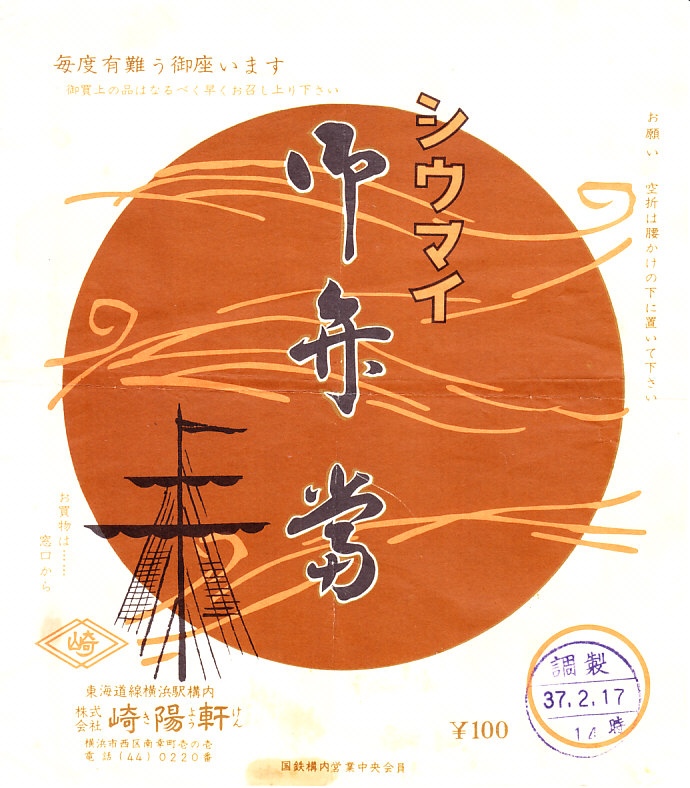1962(昭和37)年2月17日(土)14時の調製と思われる、昔の横浜駅弁の掛紙。下記の11月のものと同じく、これもまた崎陽軒の正史にない絵柄の、シウマイ弁当の掛紙。