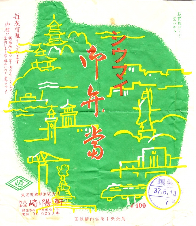 1962(昭和37)年6月13日(水)7時の調製と思われる、昔の横浜駅弁の掛紙。2代目の掛紙の、当時の普段の姿。