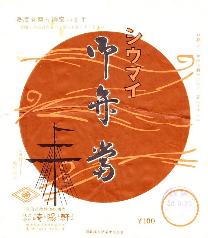 1963(昭和38)年3月23日(土)の調製と思われる、昔の横浜駅弁の掛紙。これもまたまた、2代目でも3代目でもない絵柄。調製元の正史にない版の絵柄なのかどうか。