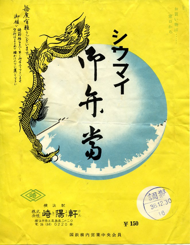 1963(昭和38)年12月30日(月)16時の調製と思われる、昔の横浜駅弁の掛紙。絵柄は3代目となり、デザインはほぼ現在のものとなった。竜が抱える中央の水晶玉に、左のマリンタワーから右の掃部山公園の井伊直弼像まで、横浜市街のシンボル群を描いた。