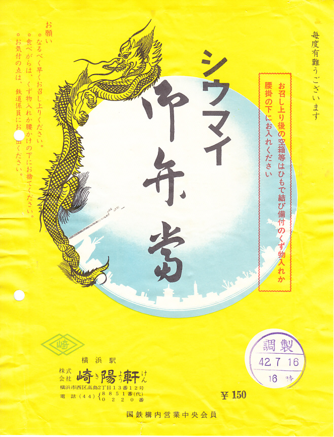 1967(昭和42)年7月16日(日)16時の調製と思われる、昔の横浜駅弁の掛紙。絵柄は上記の1963年12月のものと同じ。手書き風の文字がすべて活字に置き換わり、「空き箱等はひもで結び備付のくず物入れか腰掛けの下に」の注意書きが大きくなった。1966(昭和41)年5月1日の住居表示実施により、調製元の所在地の町名が変わった。