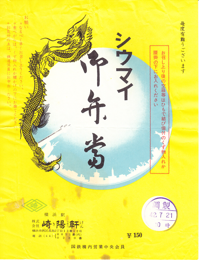 1967(昭和42)年7月21日(金)10時の調製と思われる、昔の横浜駅弁の掛紙。上記の掛紙の5日後ということで、絵柄はまったく同じ。