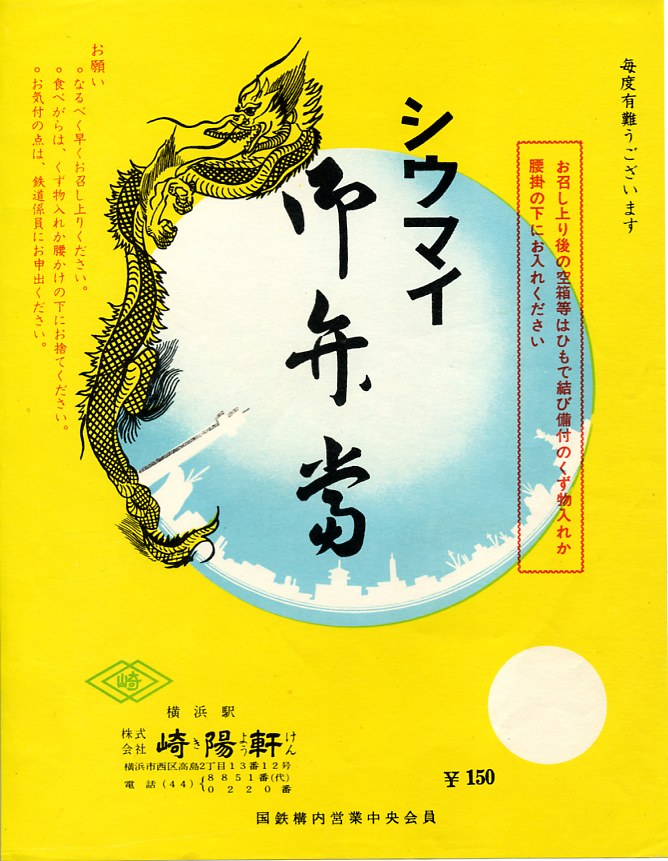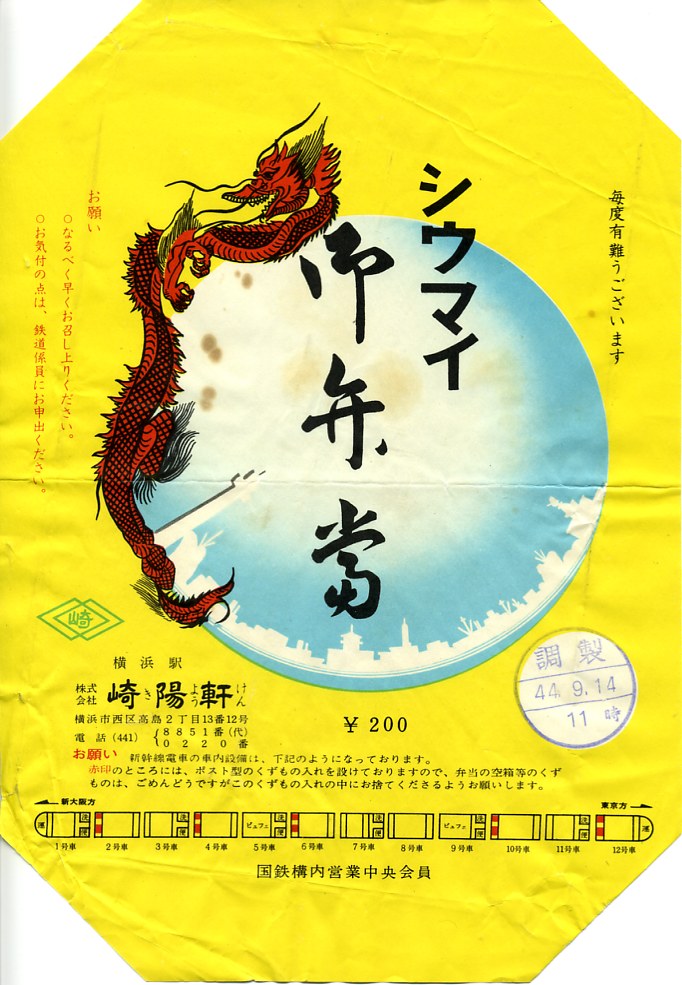 1969(昭和44)9月14日(日)11時の調製と思われる、昔の横浜駅弁の掛紙。下部に新幹線の編成表を掲載しているため、新横浜駅限定の掛紙かもしれない。上記の1968年頃の掛紙と比べて、縦に少し長くして角を落とし、価格が50円上がり、龍が赤くなった。1970(昭和45)年の大阪万博の開催に向けて輸送力を増強する前は、東海道新幹線の列車はすべて12両編成で運転されていた。
