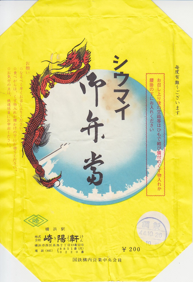 1969(昭和44)年10月26日(日)10時の調製と思われる、昔の横浜駅弁の掛紙。当時のシウマイ弁当で普通の絵柄。