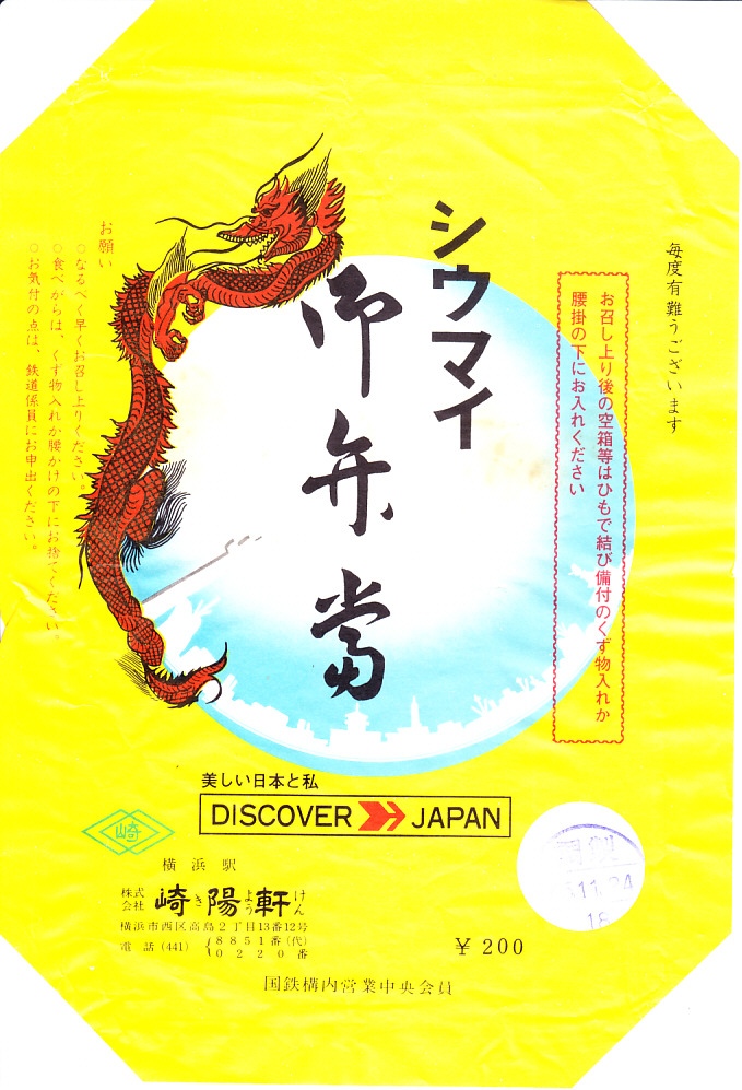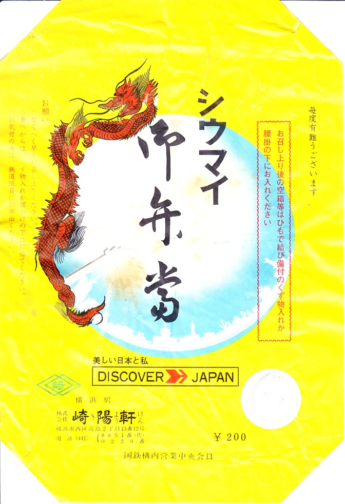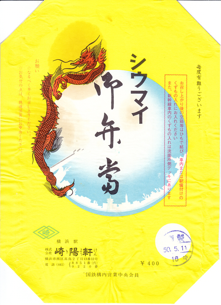 1975(昭和50)年5月11日(日)16時の調製と思われる、昔の横浜駅弁の掛紙。価格は1973(昭和48)年11月に300円へ、1974(昭和49)年9月に400円へ値上げされた。上記の1973年6月のものとの違いは、国鉄の旅行キャンペーン「DISCOVER→JAPAN」のロゴマークを消しただけ。