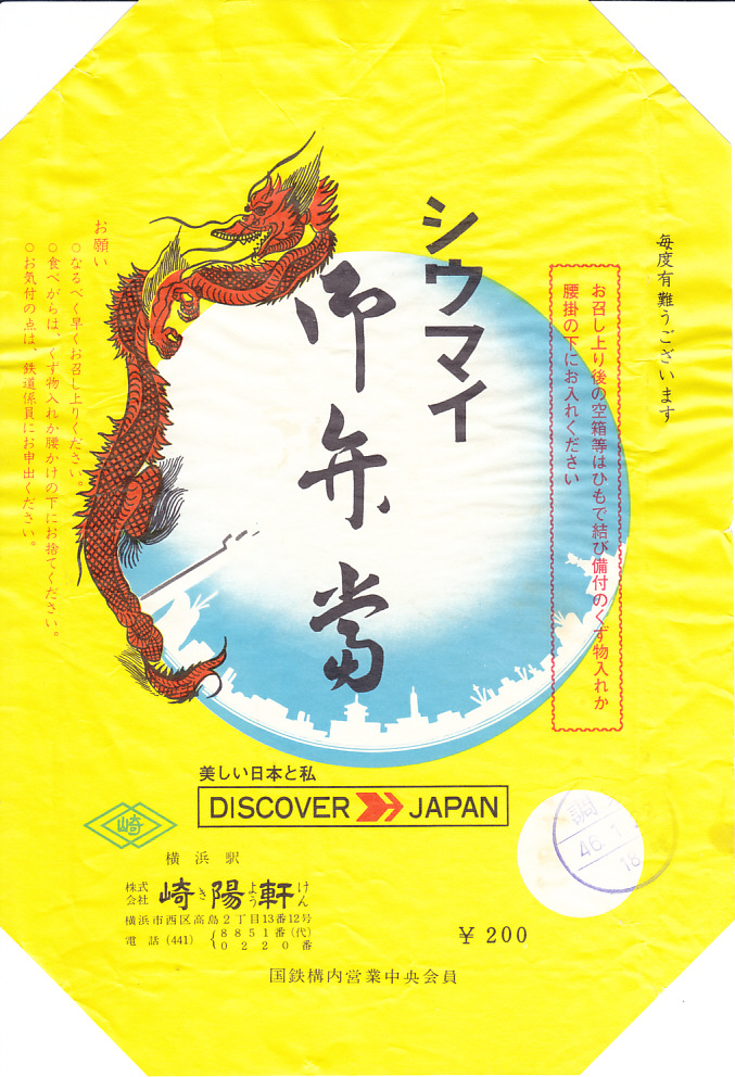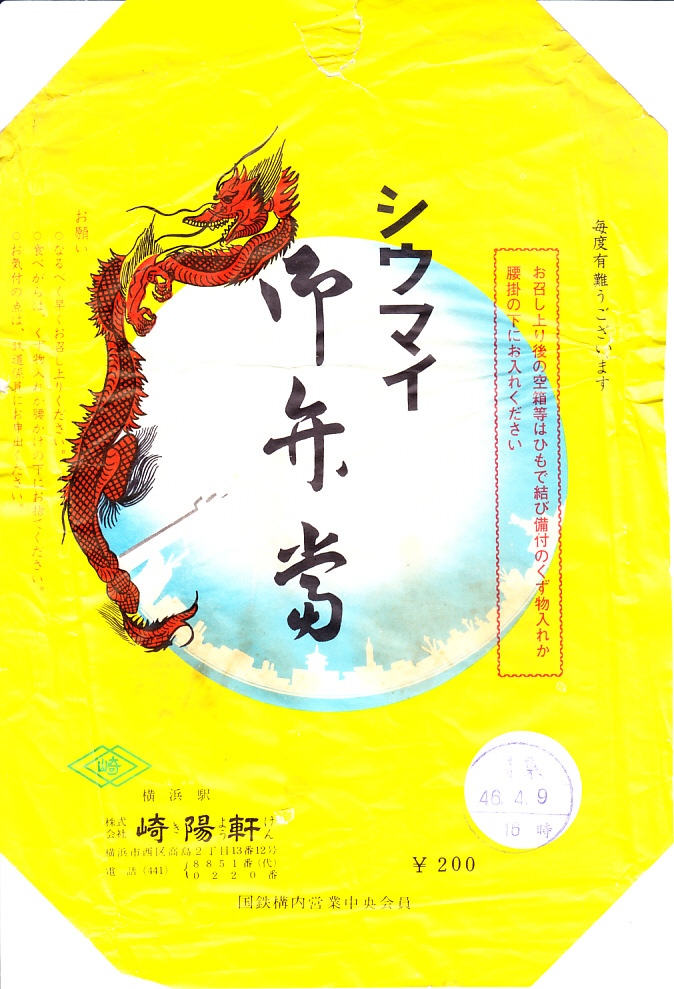 1971(昭和46)年4月9日(金)16時の調製と思われる、昔の横浜駅弁の掛紙。不思議と上記の3月のものにあったディスカバー・ジャパンのロゴが消えている。