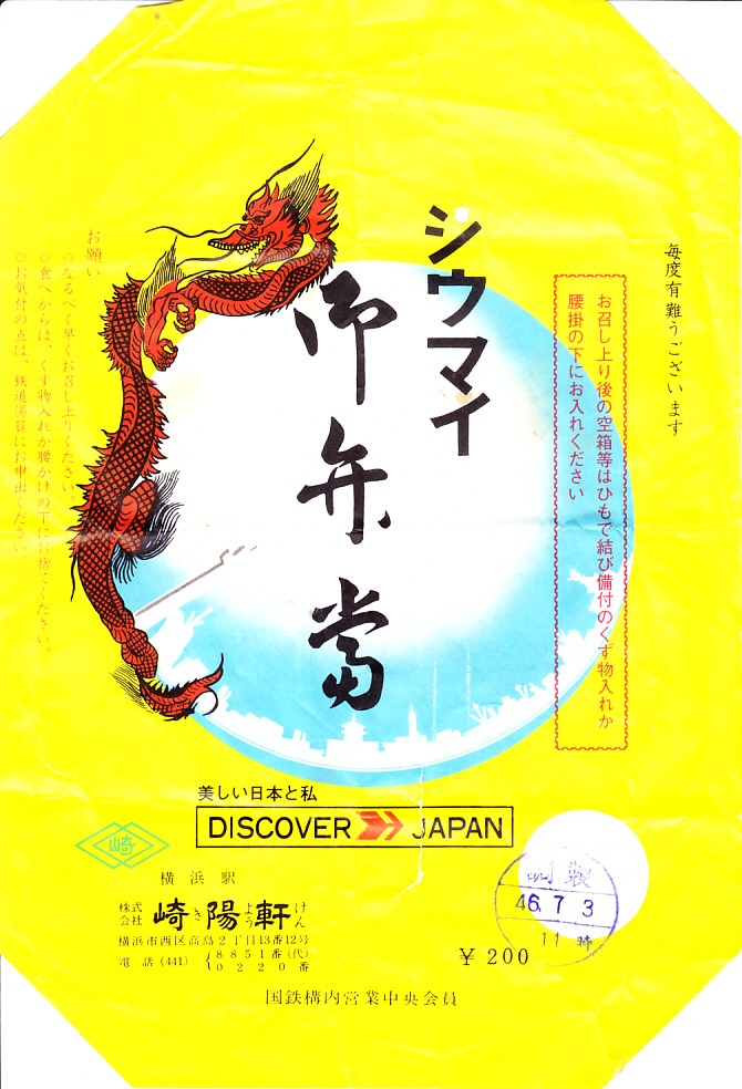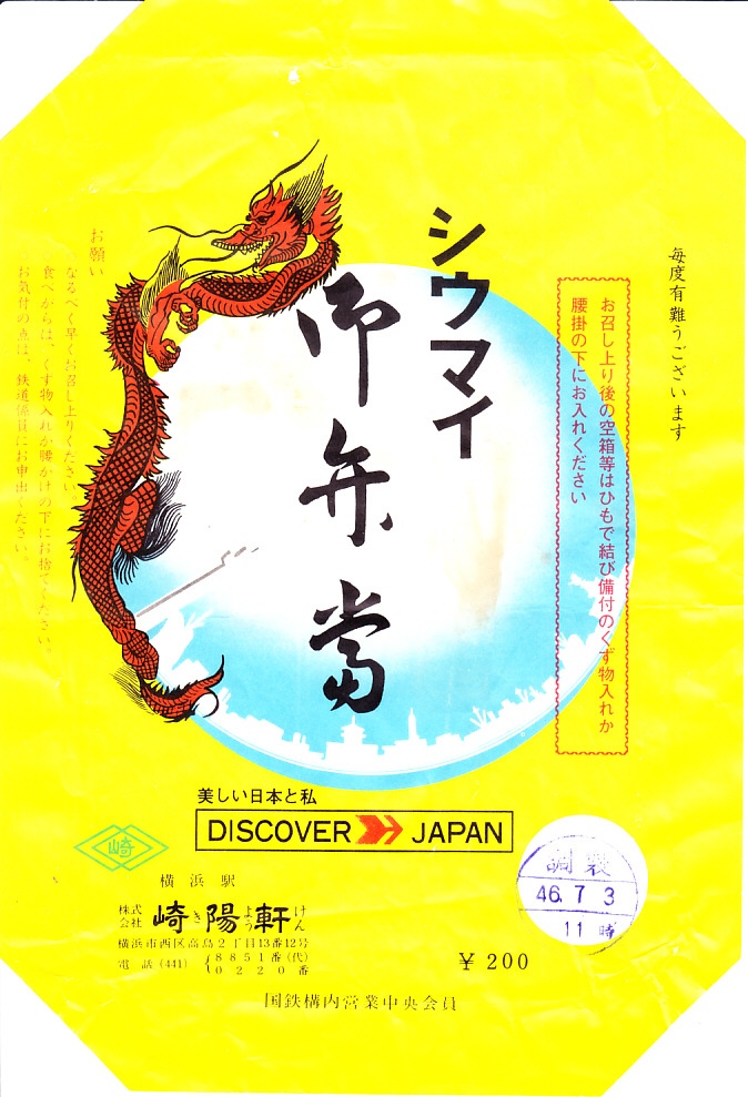 1971(昭和46)年7月3日(土)11時の調製と思われる、昔の横浜駅弁の掛紙。ディスカバー・ジャパンのロゴが復活し、上記の3月のものと同じ絵柄に戻った。同じ日時の掛紙を2枚入手。