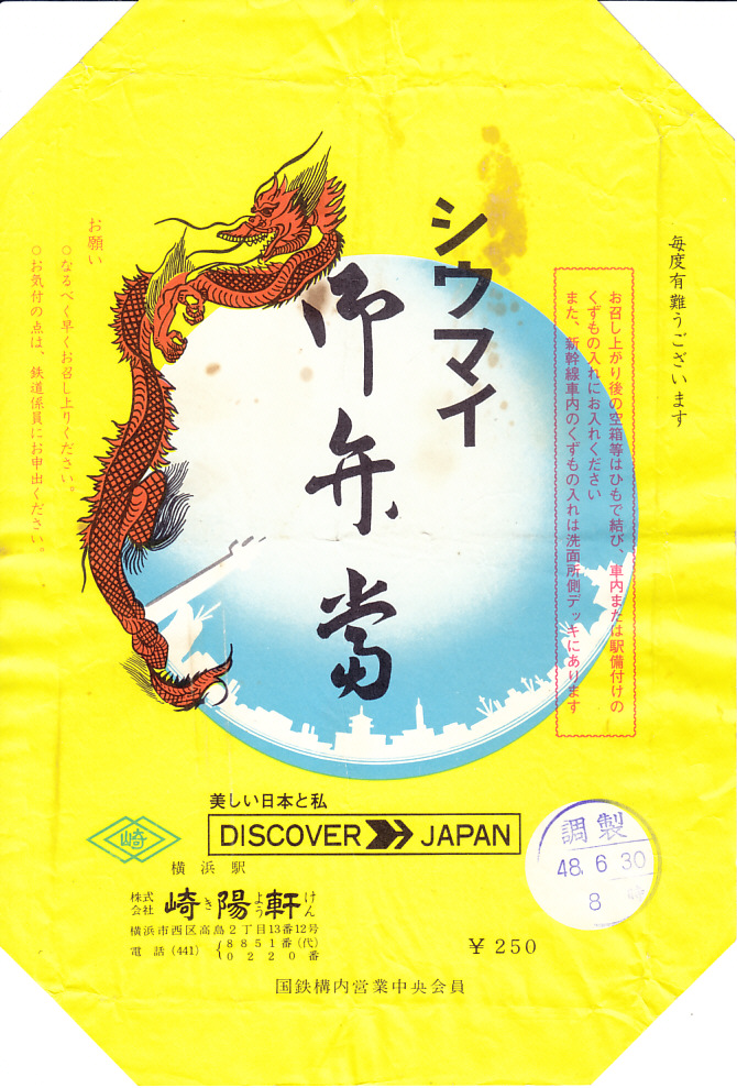 1973(昭和48)年6月30日(土)8時の調製と思われる、昔の横浜駅弁の掛紙。価格は1972(昭和47)年7月から250円。上記の1971年1月の掛紙に比べ、ごみ捨ての注意書きの左右での重複が解消し、国鉄のキャンペーンのアイコン「DISCOVER→JAPAN」の矢印が黒く変わった。