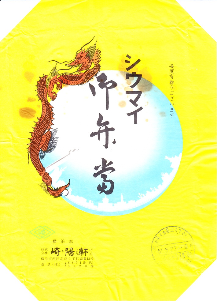 1976(昭和51)年5月23日(日)9時の調製と思われる、昔の横浜駅弁の掛紙。価格の表記がないため、駅でない場所か仕出しで使った掛紙か。絵柄と調製元の他に「毎度有難うございます」としか書かれない、シンプルな絵柄となった。