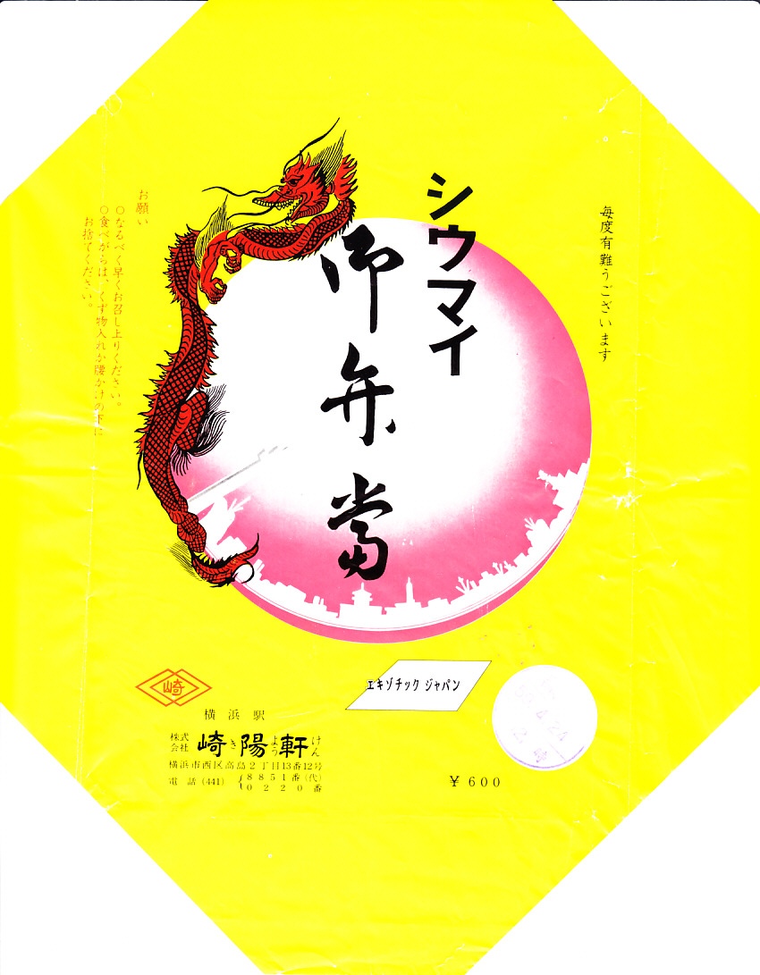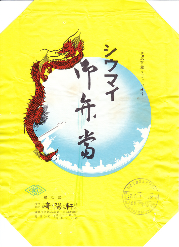 1977(昭和52)2月1日(火)13時の調製と思われる、昔の横浜駅弁の掛紙。掛紙の左右に赤文字や赤枠で記す注意書きがなく、調製印のための白抜きがなく、価格表記がなく、シウマイ弁当を含め当時の駅弁の掛紙に備わる表記がないため、これは仕出し弁当など駅でない場所で売るための掛紙かもしれない。