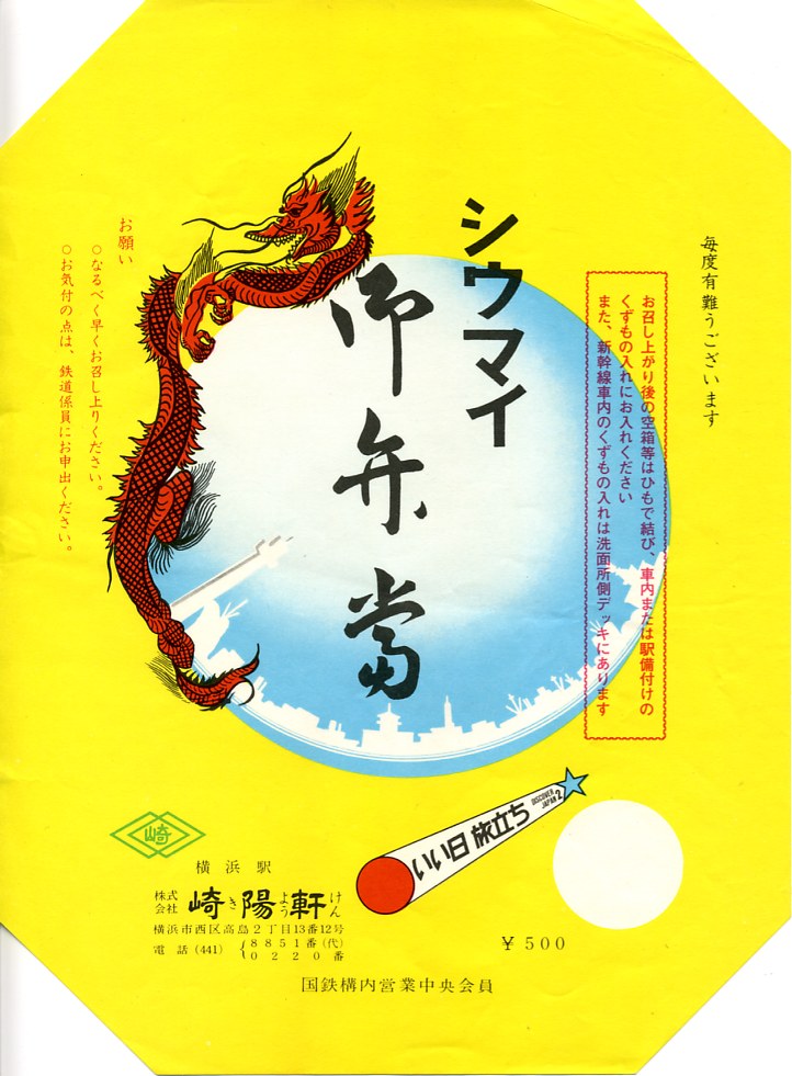 昭和50年代、1980年前後のものと思われる、昔の横浜駅弁の掛紙。価格は1977(昭和52)年7月から500円。上記の1975年5月のものからの変化は、国鉄の旅行キャンペーン「いい日旅立ち」のロゴマークを加えただけ。