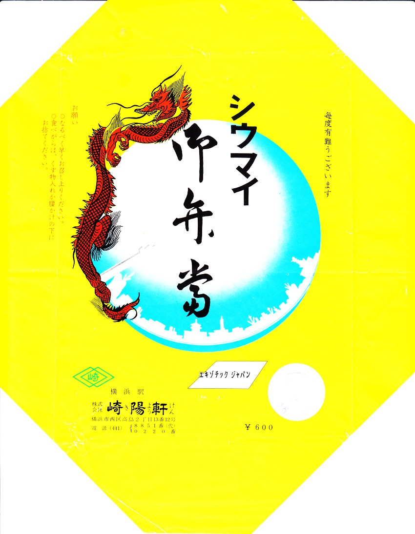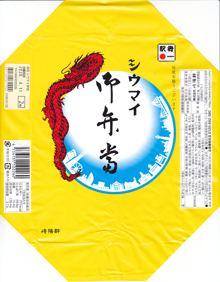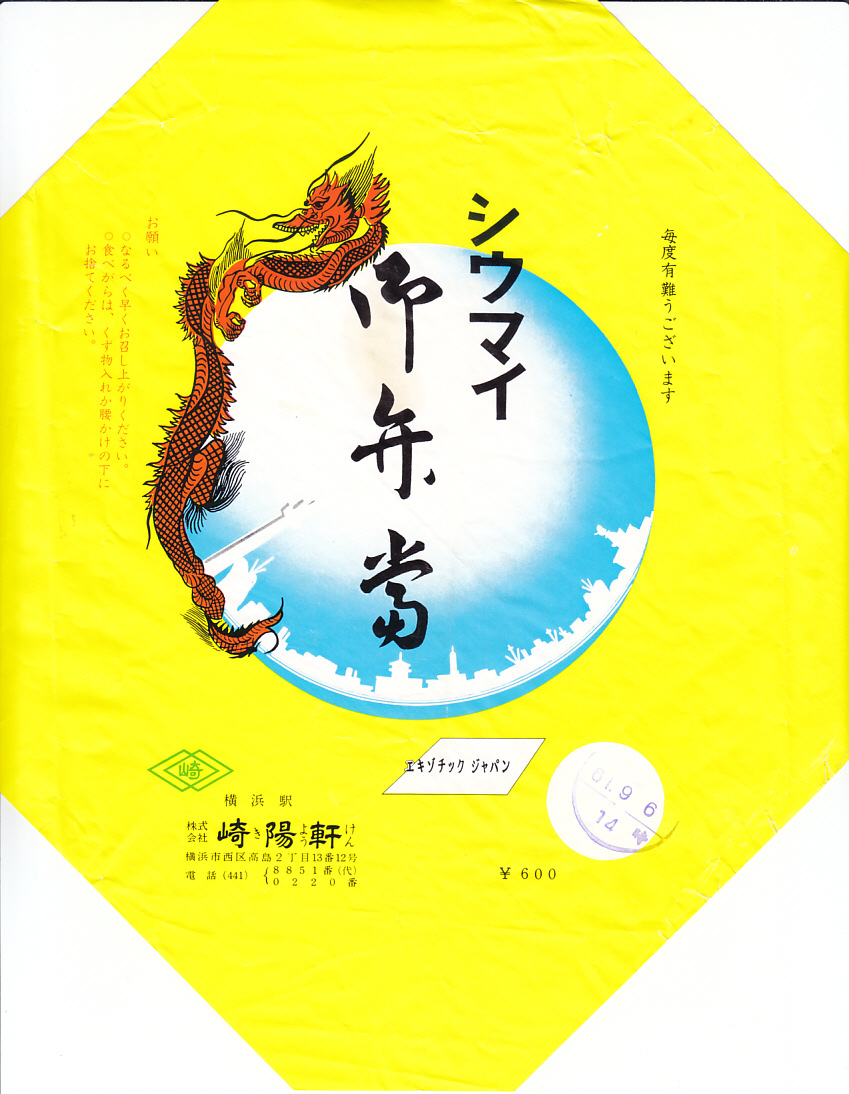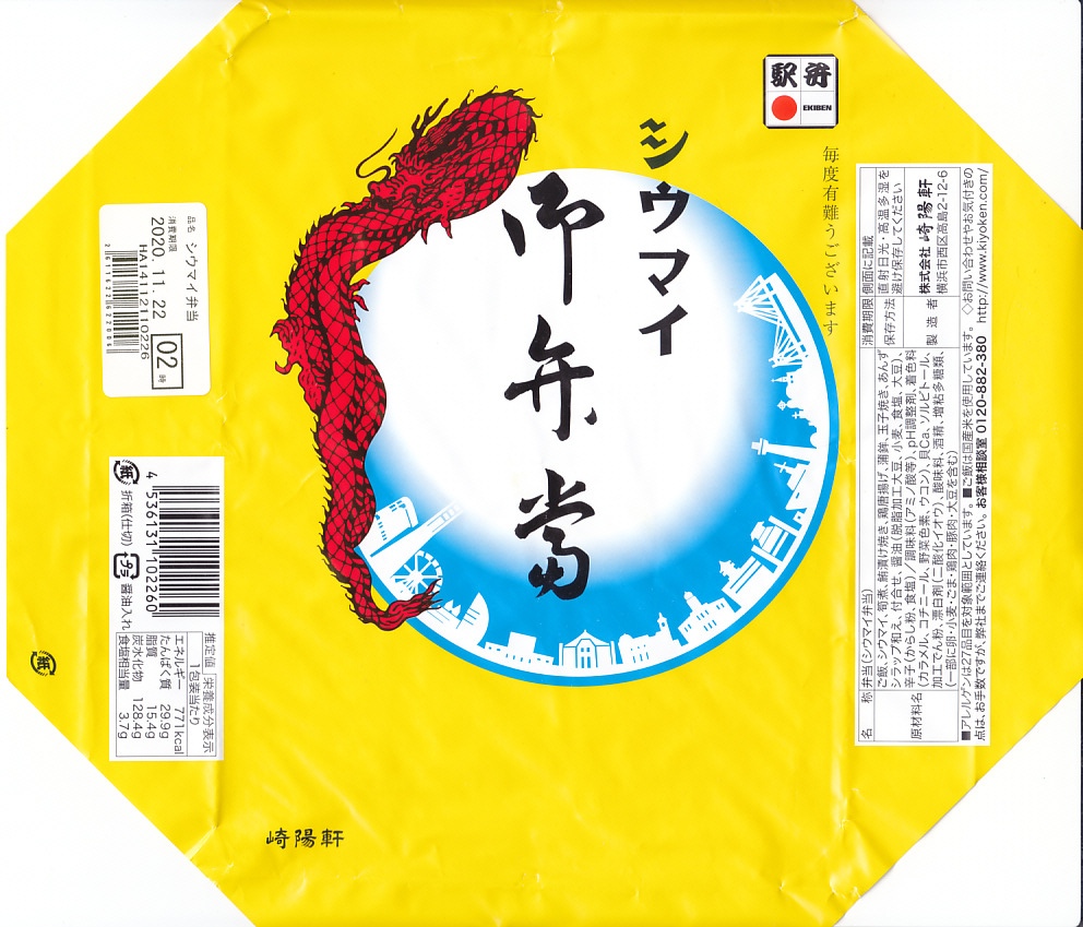 2020(令和2)年4月10日(金)に購入した、横浜駅弁シウマイ弁当の掛紙。絵柄や記載内容は、上記の2019年6月のものと変わらない。製造者が崎陽軒の「横浜工場」となっている。第三京浜道路の港北インターチェンジの近くに、1975(昭和50)年10月に設けたシウマイ工場「崎陽軒シウマイセンター」に、2017(平成29)年7月に弁当製造ラインを新設、シウマイ弁当は横浜駅前の本社工場と、1995(平成7)年11月開業の東京工場と、ここの3工場で製造されるようになった。
