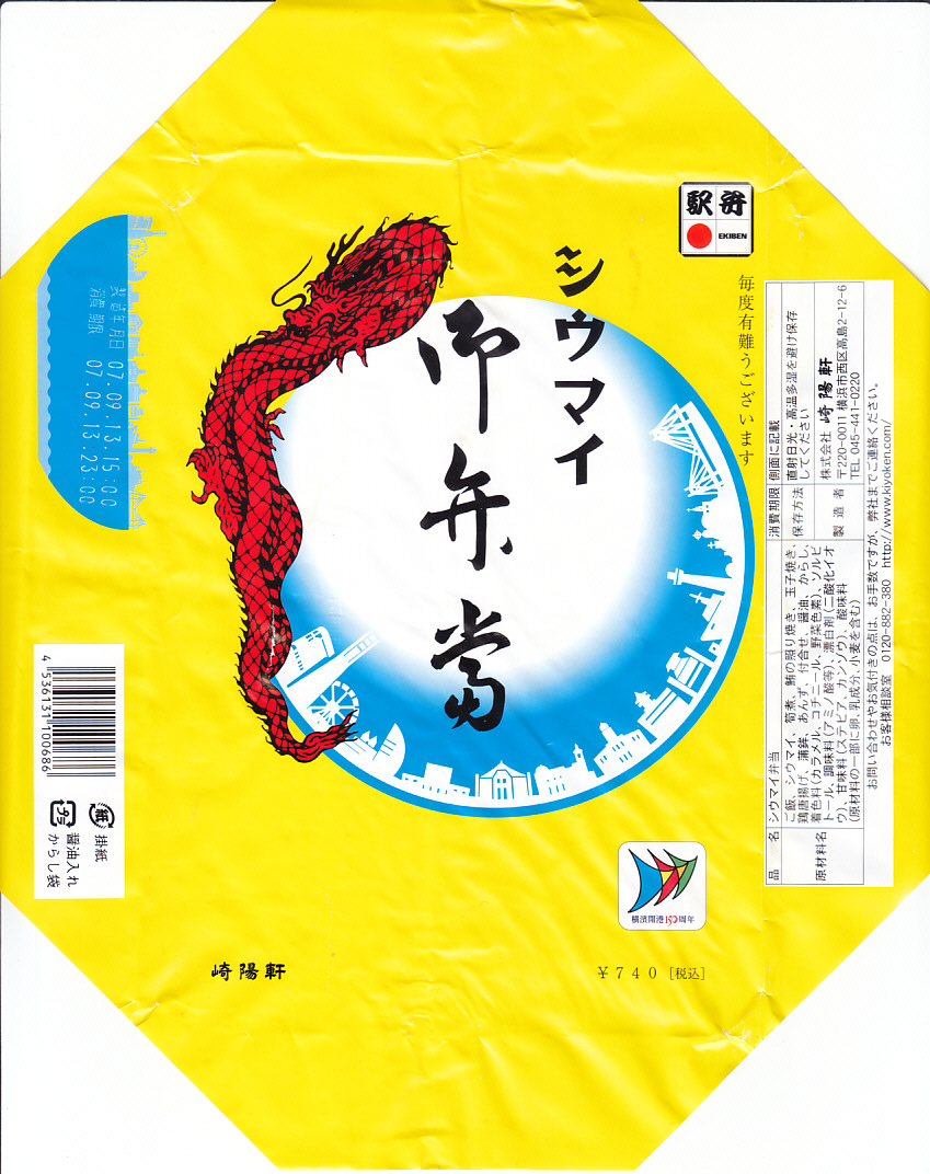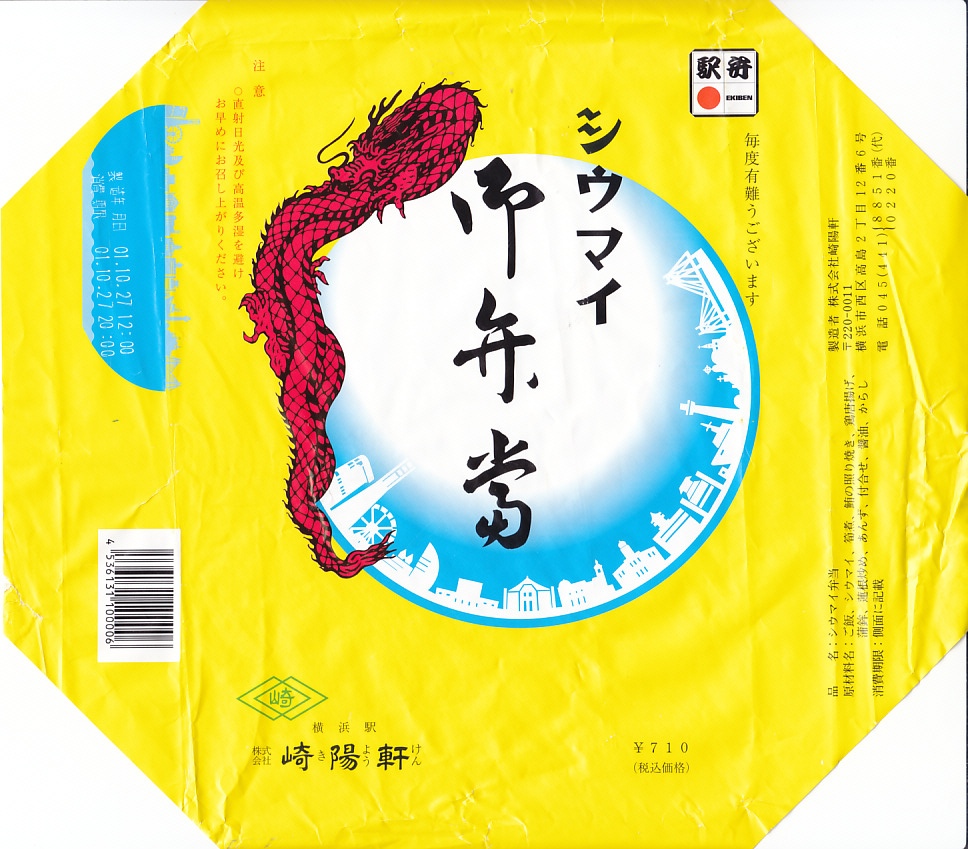 2001(平成13)年10月27日(土)12時の調製と思われる、横浜駅弁の掛紙。上記の1986年の掛紙から15年間で、1987(昭和62)年4月の国鉄分割民営化、1988(昭和63)年の駅弁マーク制定、1989(平成元)年4月の消費税導入と700円への値上げ、1995(平成7)年3月の絵柄の4代目への変更、1995(平成7)年4月の改正食品衛生法による消費期限表示、1997(平成9)年4月の710円への値上げ、2001(平成13)年4月の原材料名表示義務化を経ている。ごみ捨ての注意書きはなくなった。掛紙にバーコードを加えたほか、表面の調製印欄から左側面部に移動した製造年月日と消費期限を印字する箇所にも、水晶玉のものと同じ絵柄を持つ、横浜の町を代表するシルエットを描く。
