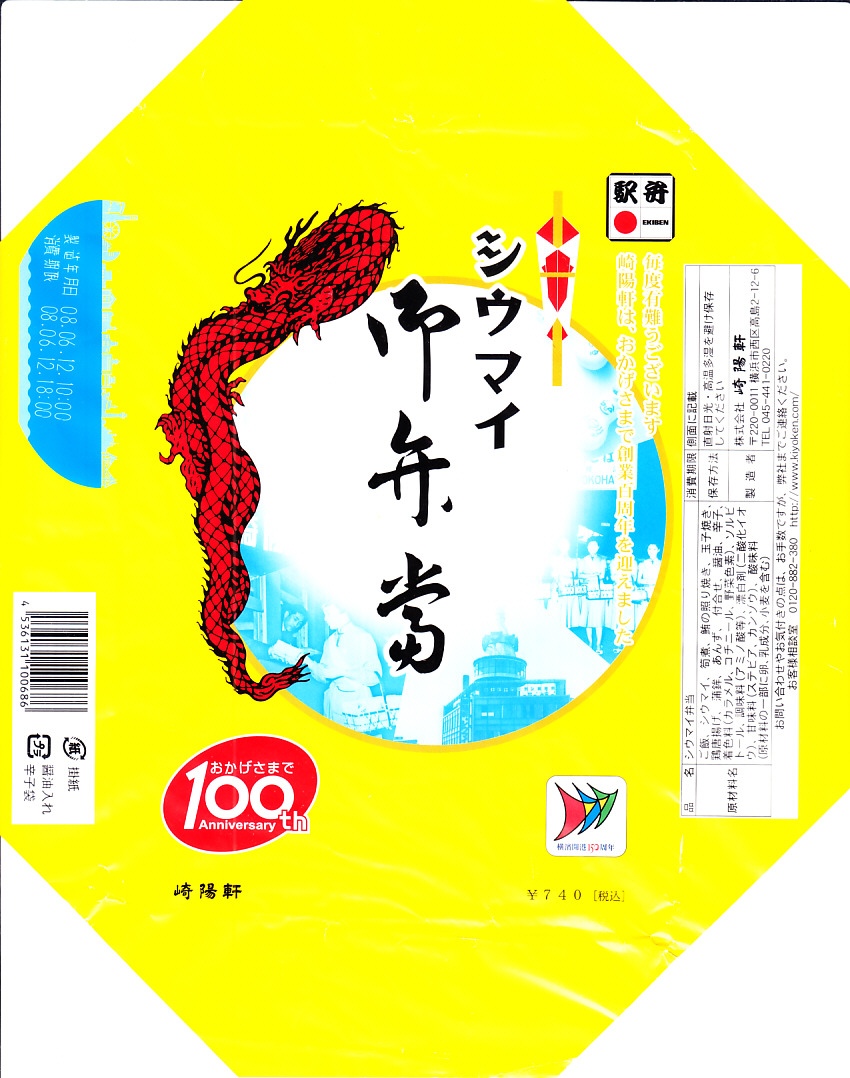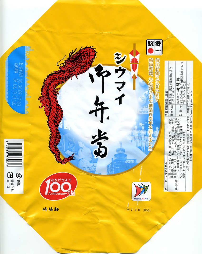 2008(平成20)年4月9日(水)に購入した、横浜駅弁シウマイ弁当の掛紙。調製元の創業100周年を記念した100企画のひとつとして、同年4月1日から12月31日まで使われた掛紙。左下に100周年記念マーク、右上に蝶花形(ちょうはながた)の熨斗(のし)を加え、水晶玉の絵柄を第二次大戦後頃の記録写真に差し替えた。