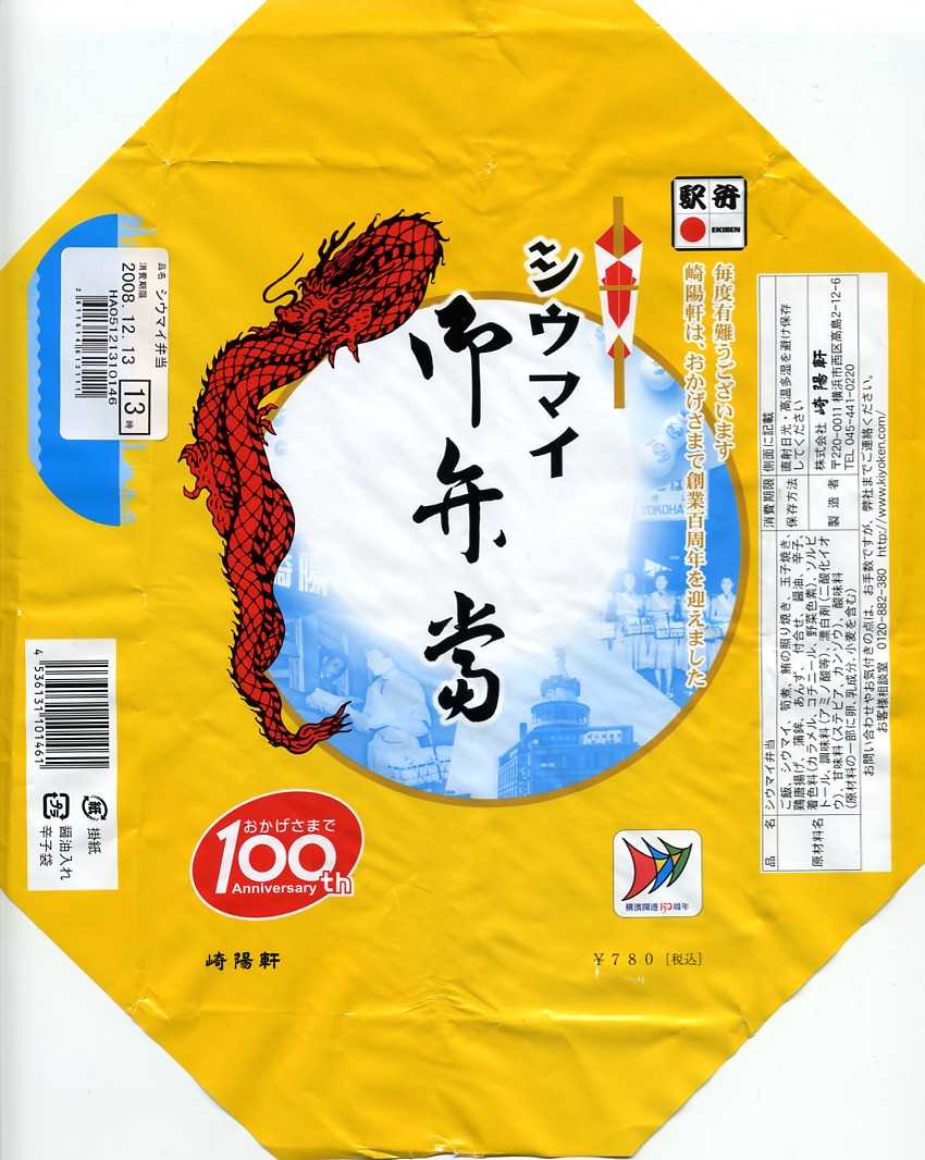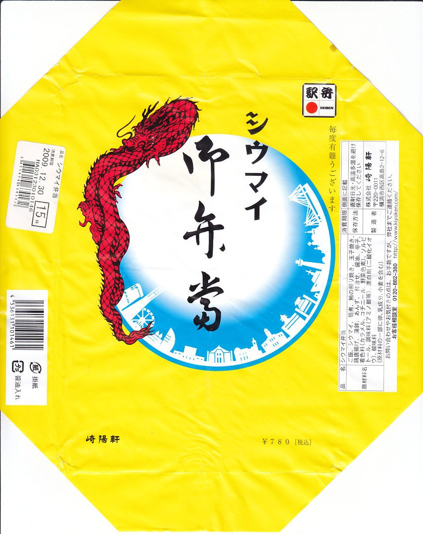 2008(平成20)年12月13日(土)に購入した、横浜駅弁シウマイ弁当の掛紙。上記の4月のものと絵柄は同じ。価格はこの年の10月から780円。製造年月日と消費期限の印字が、消費期限のみのシールに変わった。