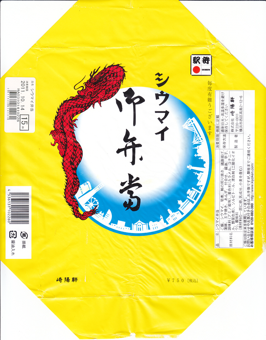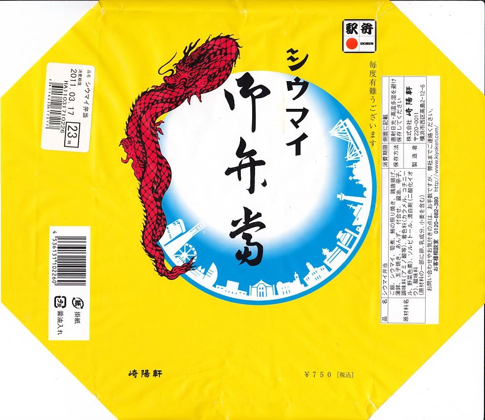 2011(平成23)年3月17日(木)に購入した、横浜駅弁シウマイ弁当の掛紙。価格は2010(平成22)年9月から750円に値下げ。その価格を除き、絵柄は上記の2010年8月のものと同じ。