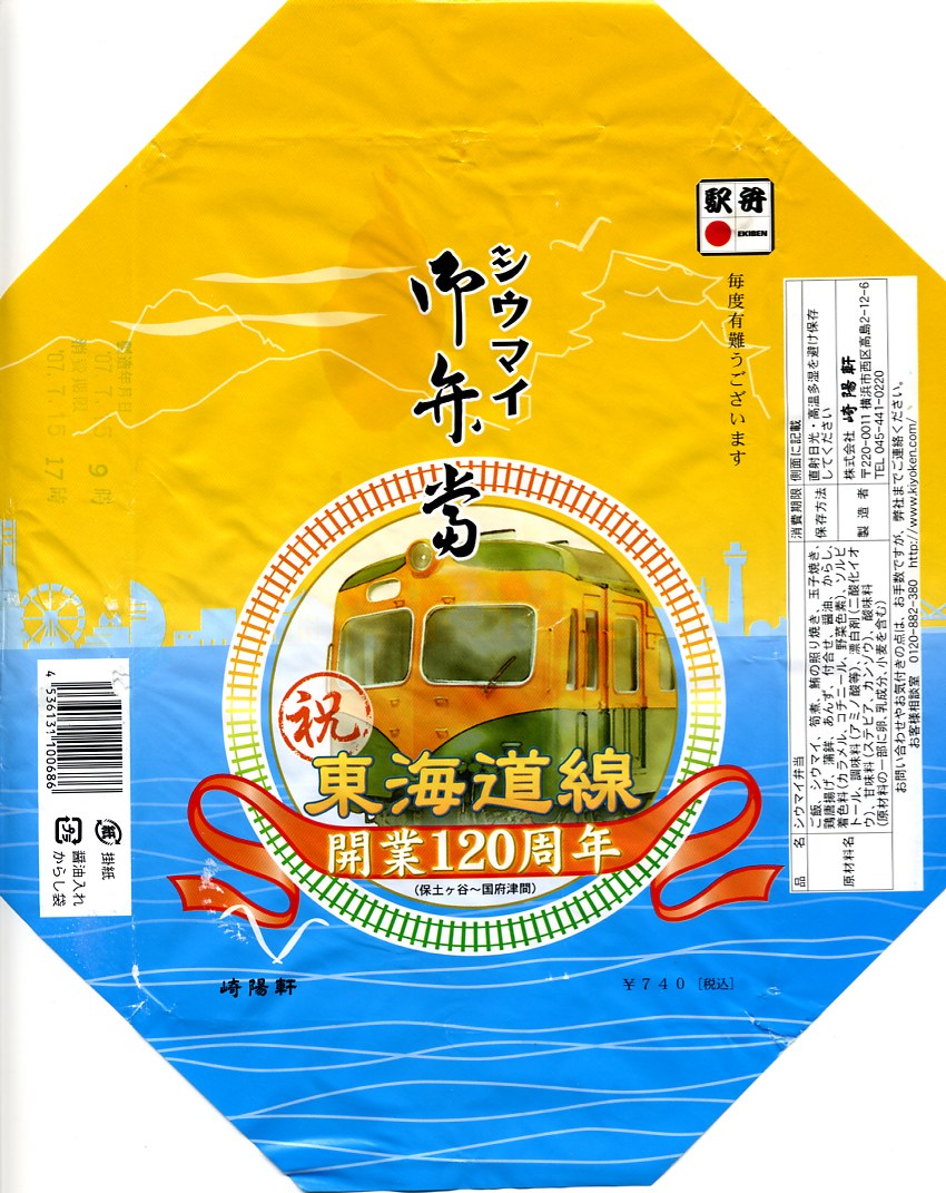 2007(平成19)年7月21日(土)に購入した、横浜駅弁シウマイ弁当の掛紙。価格は2007(平成19)年3月から740円。東海道本線の横浜駅・国府津駅間の開業120周年を記念して、横浜駅と保土ヶ谷駅の売店に限り、同年7月11日から24日までこの記念デザインの掛紙をかけて販売した。描かれた車両は、1950(昭和25)年に当時としては斬新なデザインと車体色で東海道本線の東京駅と沼津駅との間を走り始め、湘南電車の愛称が付いた国鉄80系電車。国鉄と鉄道と日本の戦後史に刻まれる名車なのに、この形状の車両はすべてスクラップになり、一両も保存されなかった。