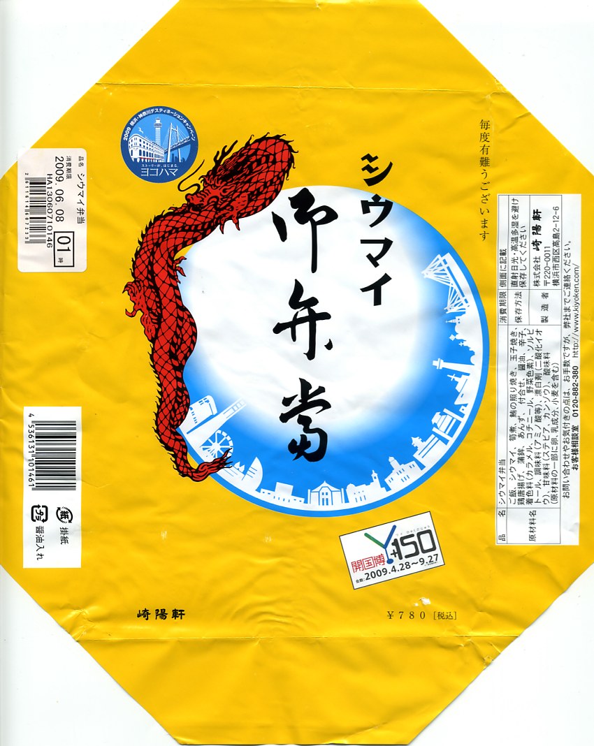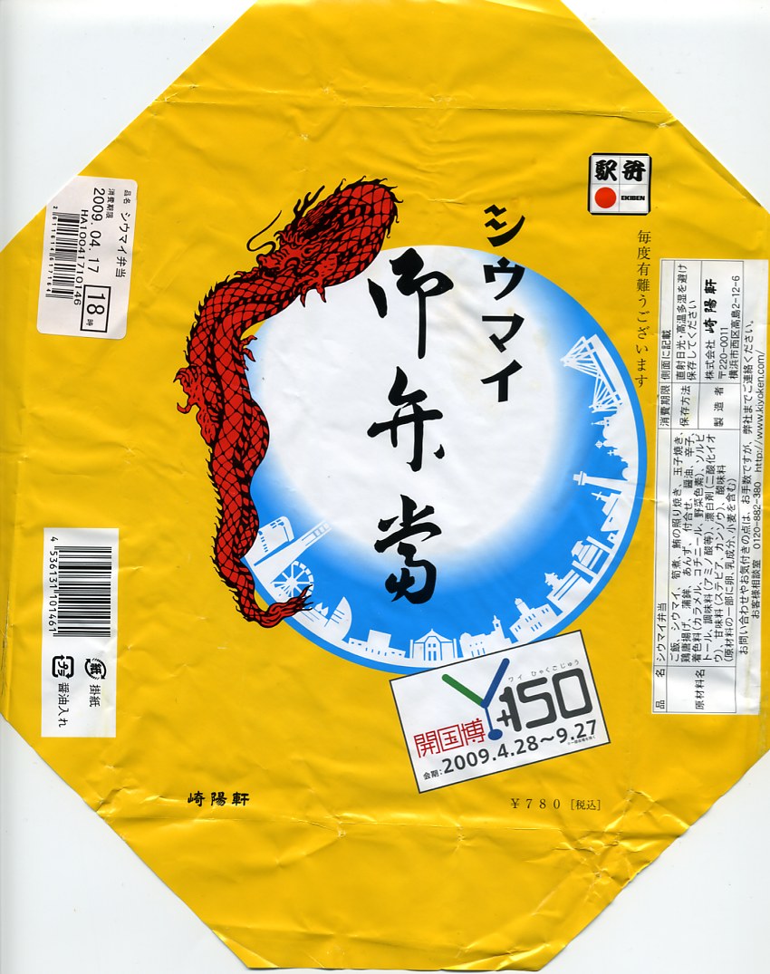 2009(平成21)年4月17日(金)に購入した、横浜駅弁シウマイ弁当の掛紙。上記の2007年9月のものと比べて、横浜の町を代表するシルエットを描く製造年月日と消費期限の欄がなくなり、横浜開港150周年記念事業のロゴマークを、横浜開港150周年を記念した博覧会「開国博Y150」のマークに差し替えた。この年の4月28日から9月27日までみなとみらいエリアで開催された博覧会は、内容の薄さで500万人の有料入場者集客目標が124万人に留まり、会期終了を待たずに横浜市長が突然に辞任、終了後も博覧会協会とチケット販売の旅行会社が訴訟合戦を繰り広げたり、広告代理店への支払額について裁判所へ特定調停を申し立てたりの混乱で、横浜市政に大きな汚点を遺した。
