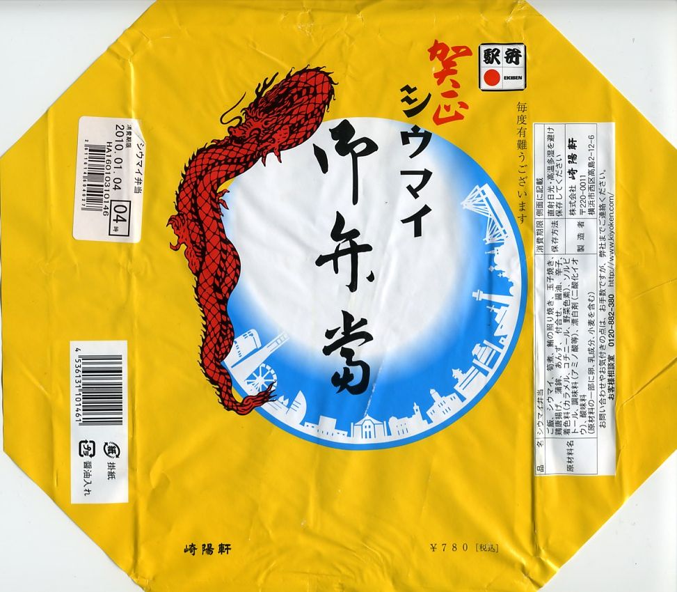 2010(平成22)年1月3日(日)に購入した、横浜駅弁シウマイ弁当の掛紙。右上に「賀正」の赤文字が記され、正月の記念掛紙であることが分かる。昭和時代には多くの駅弁屋が元日頃に特別の掛紙を使用していたが、今ではとても少なくなった。
