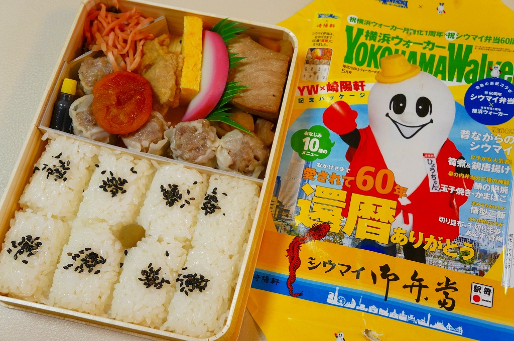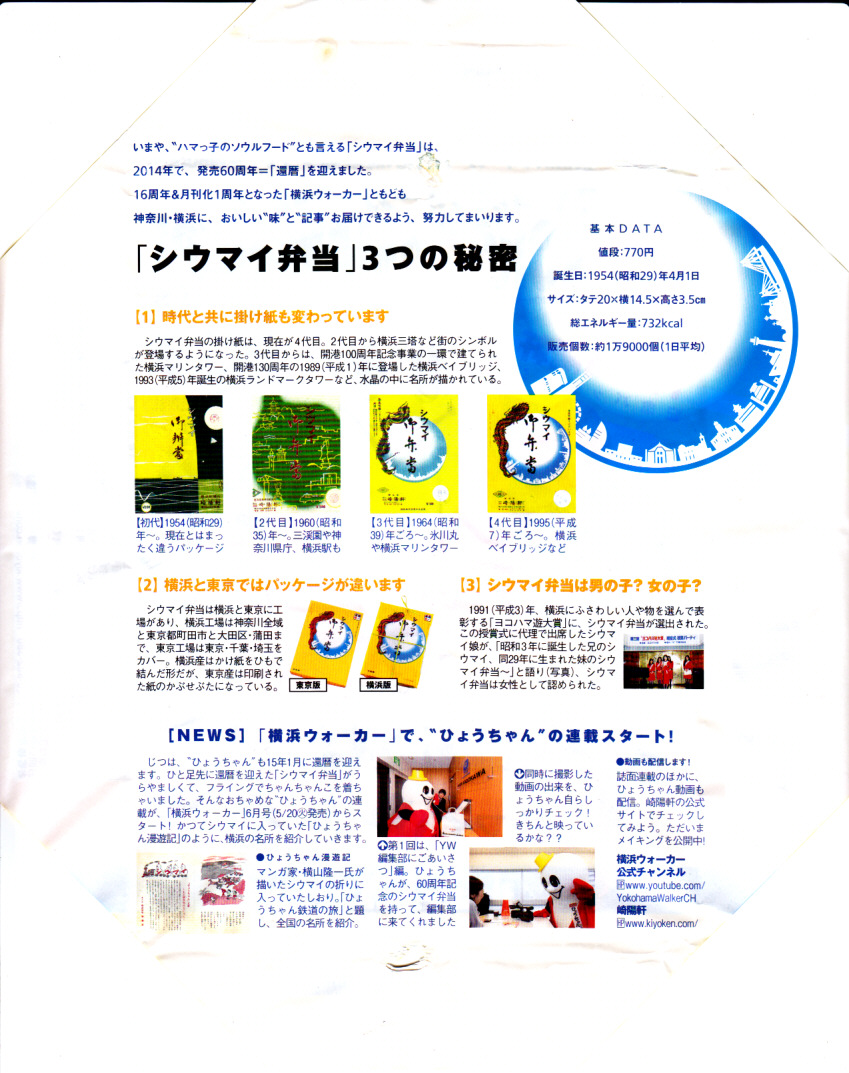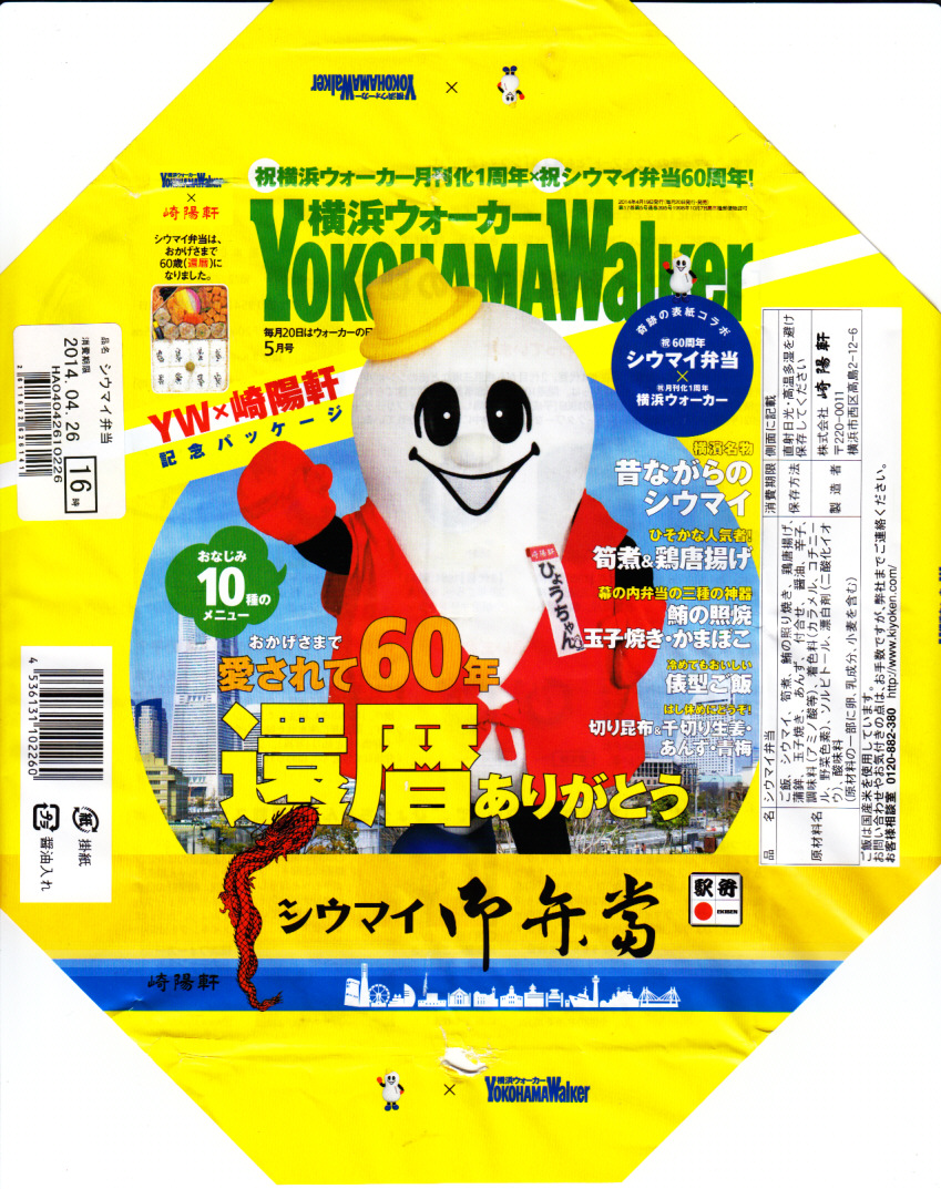 2014(平成26)年4月26日(土)に購入した、横浜駅弁シウマイ弁当の掛紙。KADOKAWAの雑誌「横浜ウォーカー」の月刊化1周年と「シウマイ弁当」の発売60周年を記念して、2014(平成26)年4月25日から27日まで、雑誌の表紙のようなデザインの掛紙で販売した。中身や価格は通常版と同じ。シウマイ弁当と企業とのタイアップは、これが初めてだという。前年は「炒飯弁当」で実施した。シウマイ弁当の掛紙の両面印刷もまた、初めて見た。