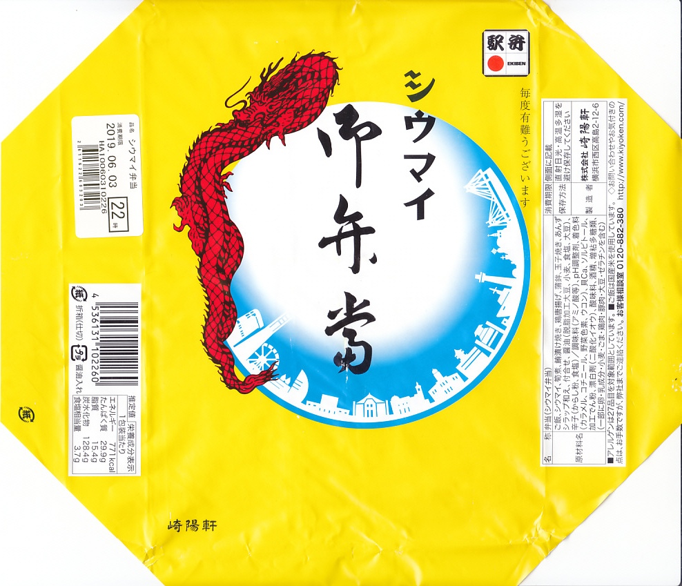 2019(令和元)年6月3日(月)に購入した、横浜駅弁シウマイ弁当の掛紙。絵柄は上記の2017年12月やそれ以前から変わらない4代目掛紙だが、法令の強化で左や右の表記の文字数や情報量が、またずいぶんと増えている。昭和時代には鉄道官庁や国鉄の意向で増減した表記は、平成時代には食品その他国の規制の増加や厳格化で増加するようになった。