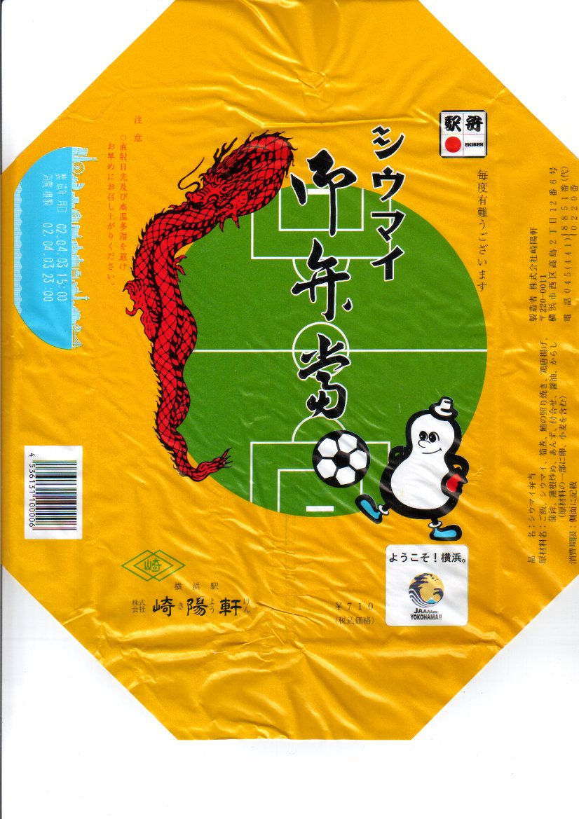 2002(平成14)年4月3日(水)に購入した、横浜駅弁シウマイ弁当の掛紙。同年6月の横浜でのサッカーW杯の決勝戦開催を記念して、4月1日から6月30日まで使用されたもの。普段のシウマイ弁当の掛紙の構成を残したまま、水晶玉をサッカー場に替え、崎陽軒の磁器の醤油入れのキャラクター「ひょうちゃん」がサッカーボールを蹴るイラストを加えた。横浜駅弁のうち1,050円の冷蔵シウマイは、サッカーW杯の公式ライセンス商品になったが、シウマイ弁当はそうならなかったようだ。