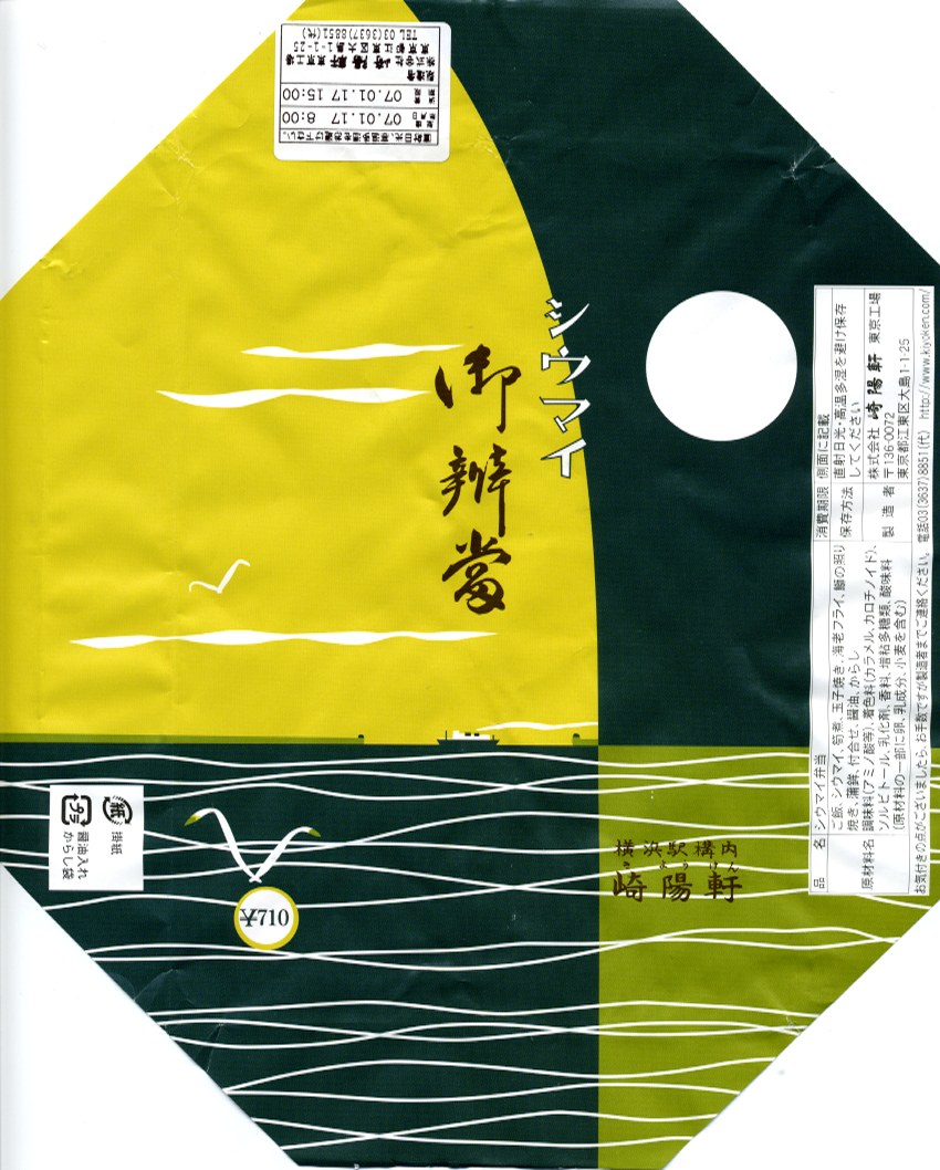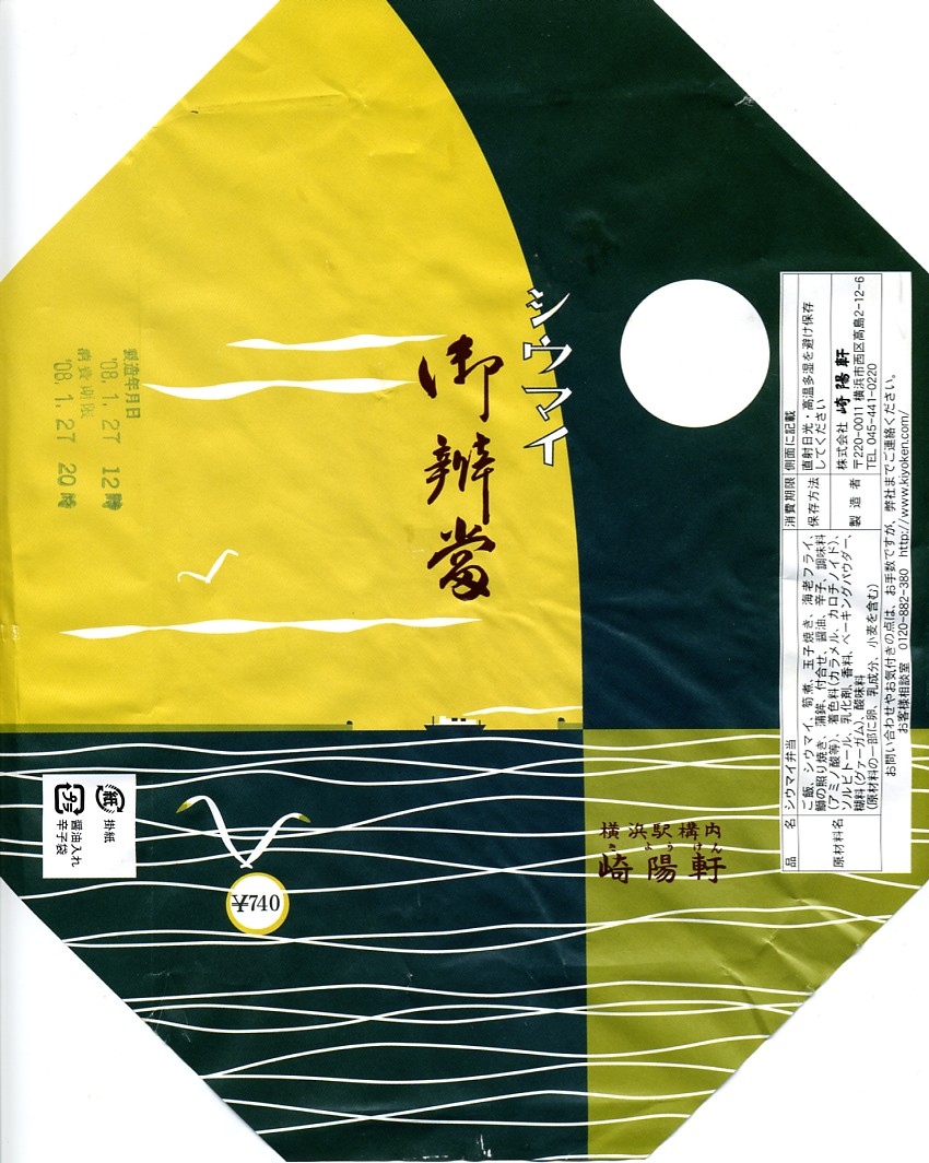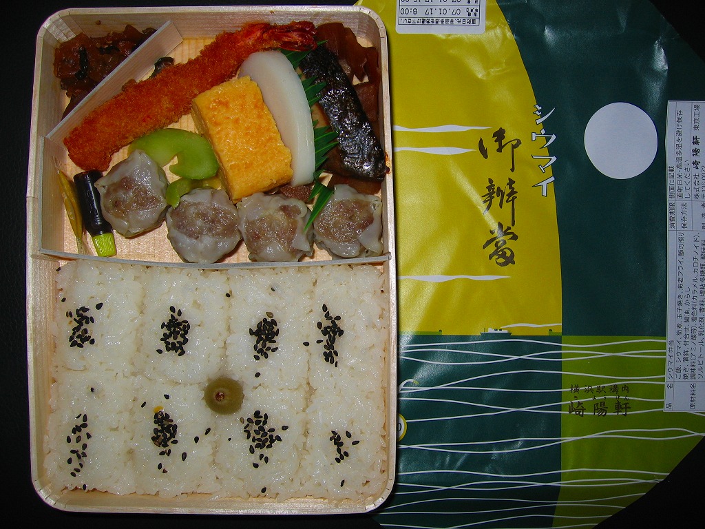 下記駅弁の翌年に買えた、復刻版シウマイ弁当。今回はJR横浜支社が管内の駅弁屋4社を集めて、2008(平成20)年1月26・27日に横浜駅西口で実施したイベント「どんどん食べて!!記念・限定駅弁フェア」で買えた。中身は同じだが、2007年3月の現行版シウマイ弁当の価格改訂が反映されている。今後も時々、イベントに出てくるのだろう。