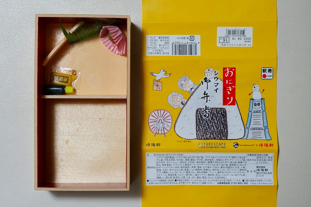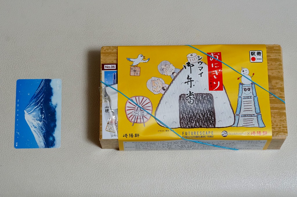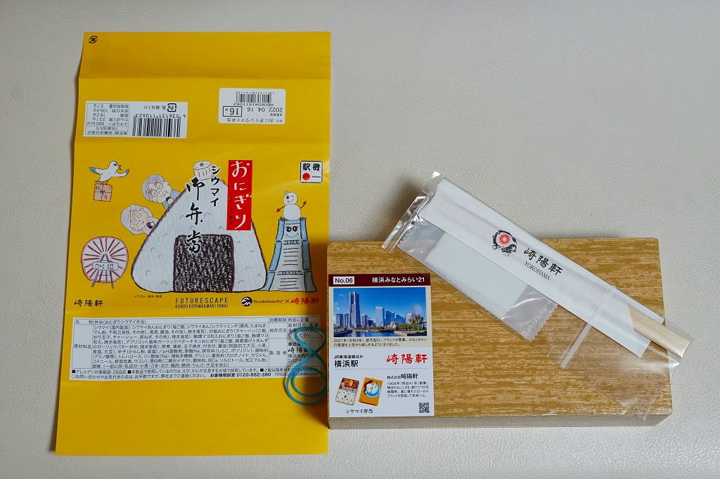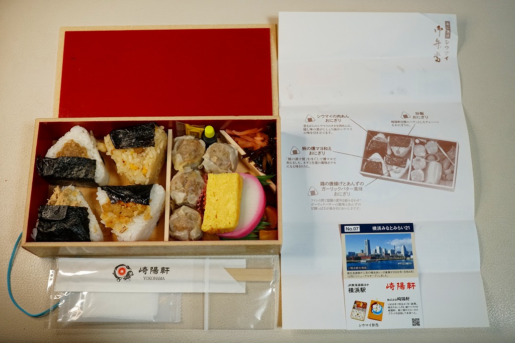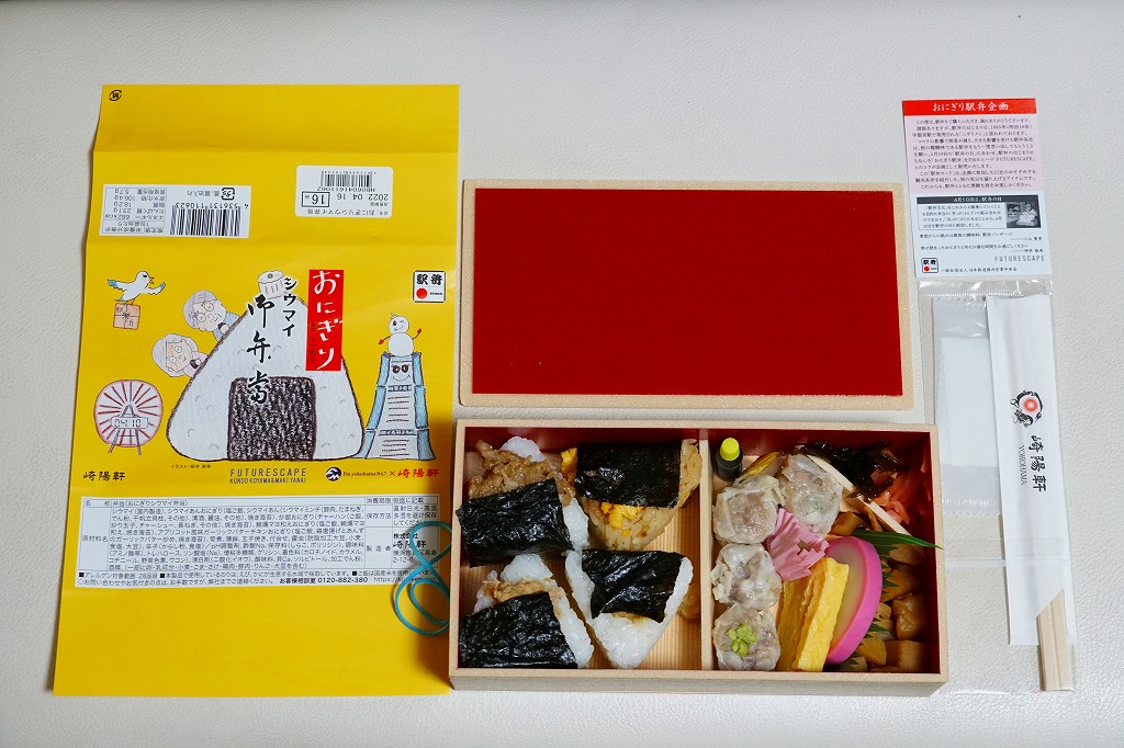 商品名は「おにぎりシウマイ弁当」とも。今回は2024(令和6)年4月8日から10日まで、調製元のネット通販での完全予約制で、約130店舗にて4,200個を販売。今回も駅弁の日に合わせ、日本鉄道構内営業中央会の会員のうち31社が各社おすすめ駅弁に共通ノベルティ「千社札風カード」を添付して期間限定で販売した駅弁の、横浜駅バージョンになった。