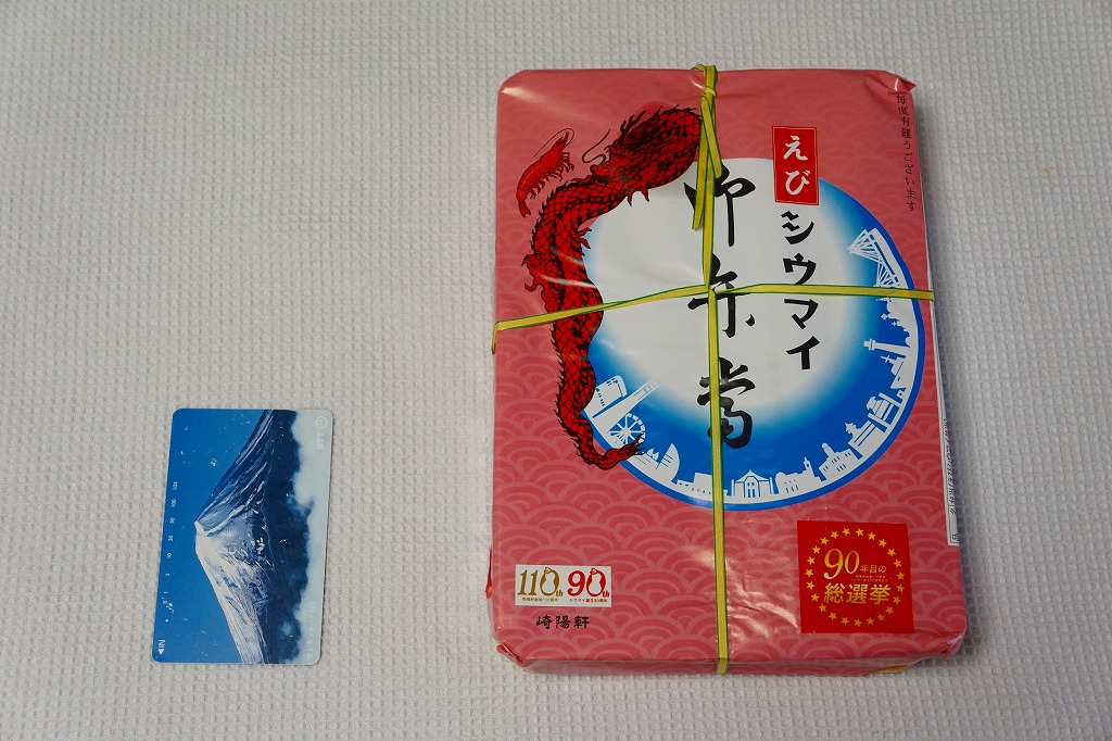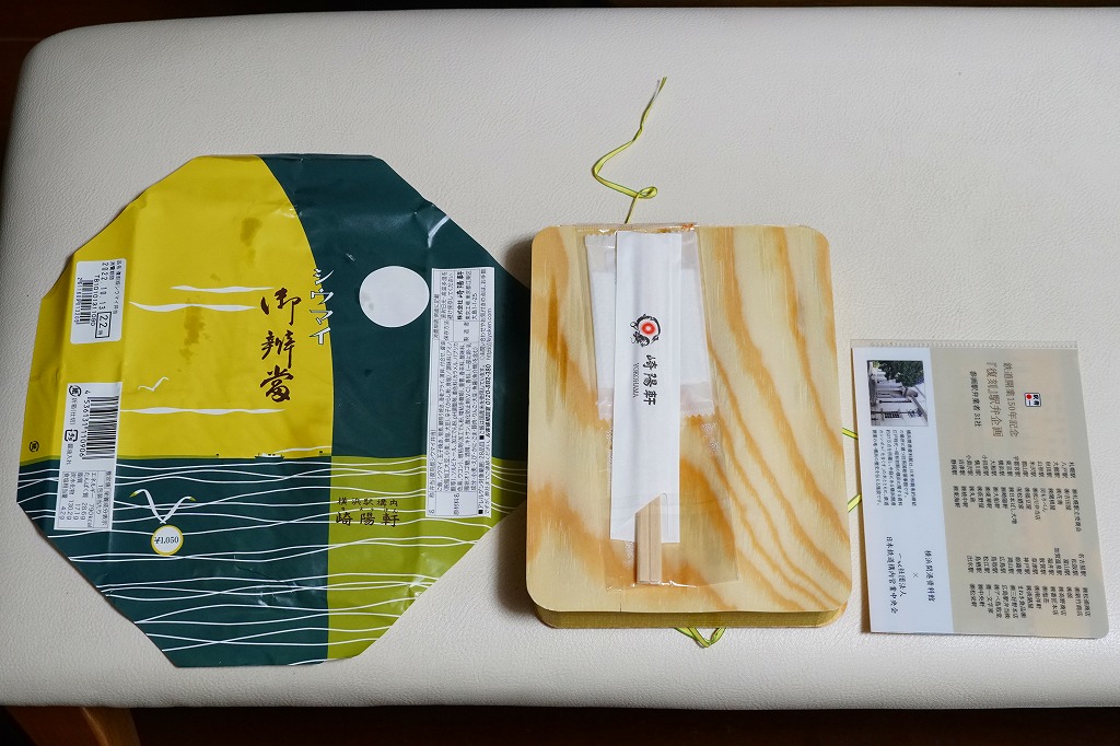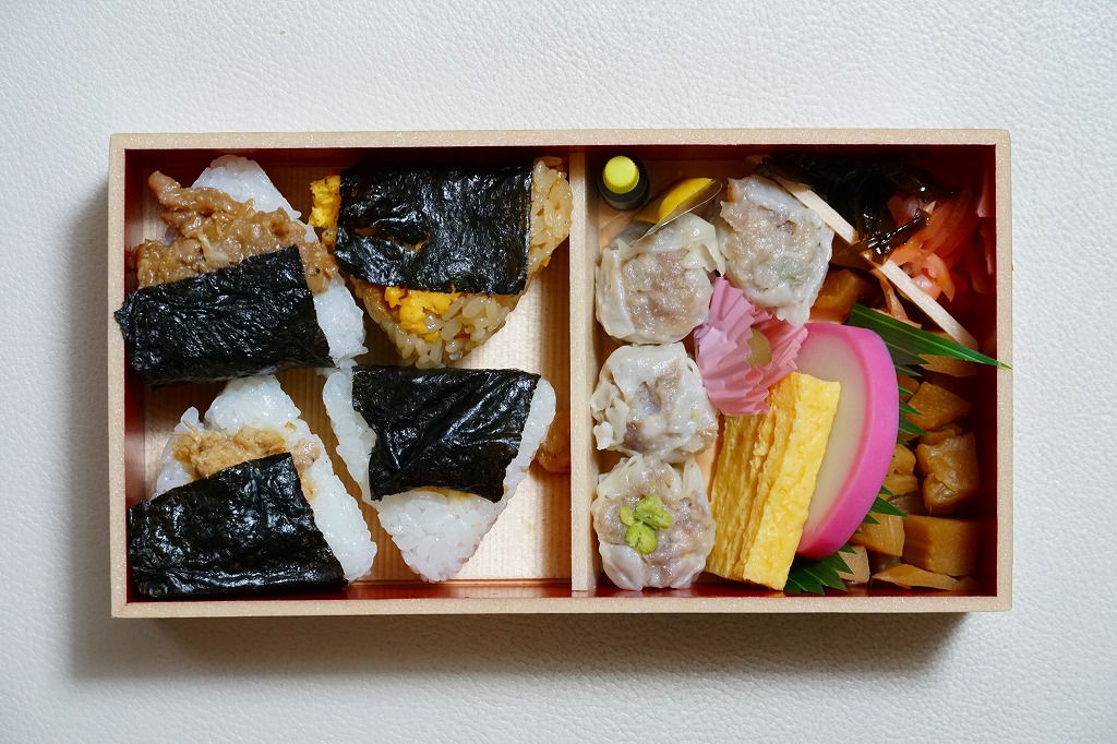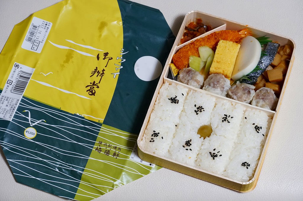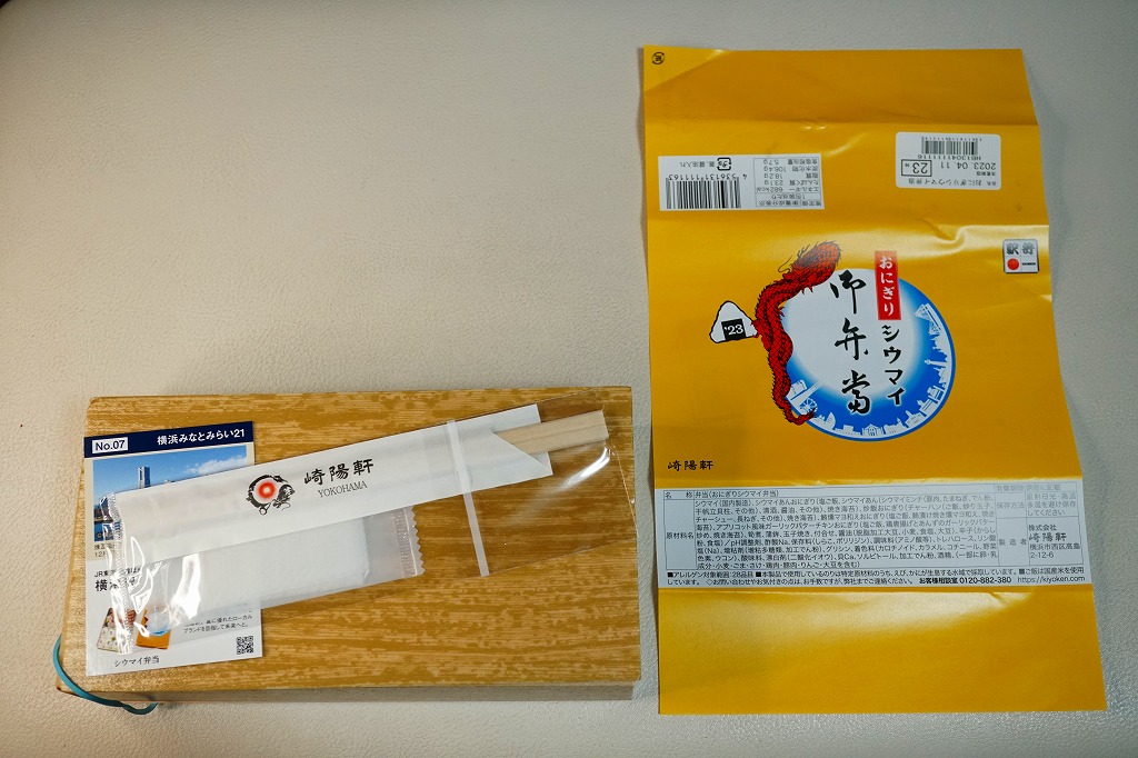 商品名は「おにぎりシウマイ弁当」とも。今回は2024(令和6)年4月8日から10日まで、調製元のネット通販での完全予約制で、約130店舗にて4,200個を販売。今回も駅弁の日に合わせ、日本鉄道構内営業中央会の会員のうち31社が各社おすすめ駅弁に共通ノベルティ「千社札風カード」を添付して期間限定で販売した駅弁の、横浜駅バージョンになった。
