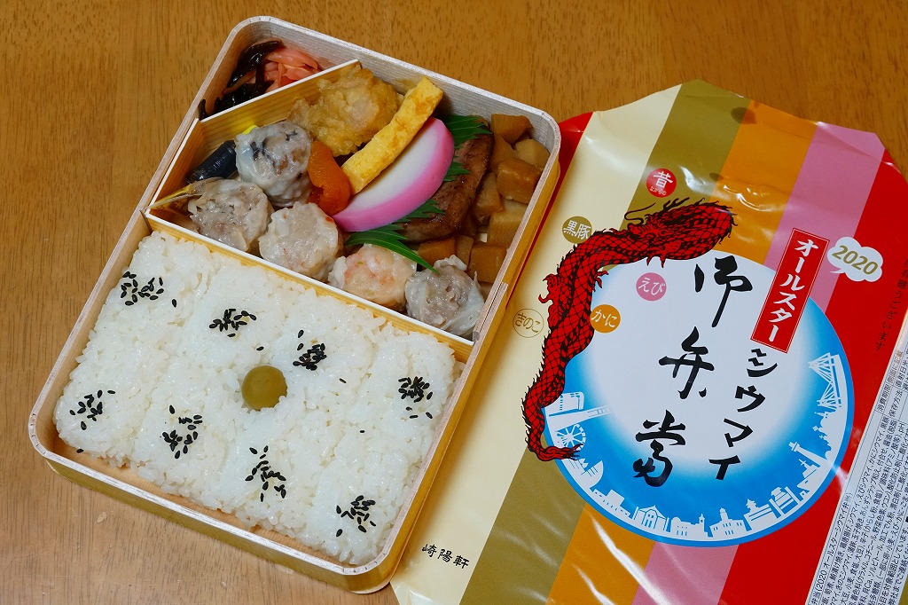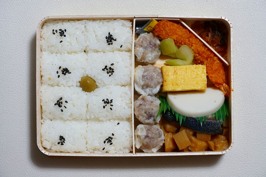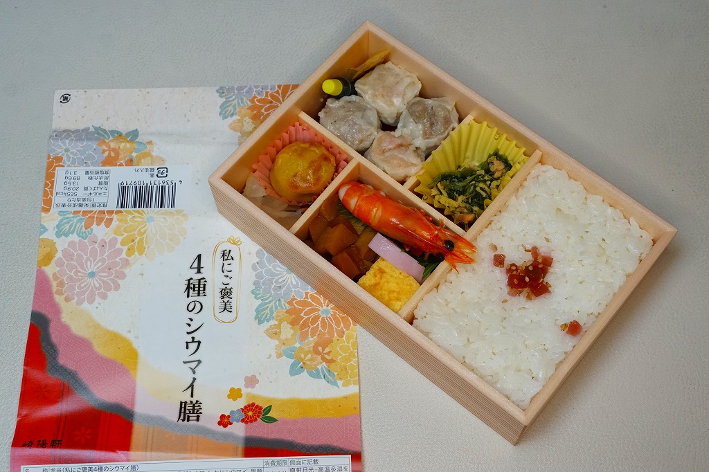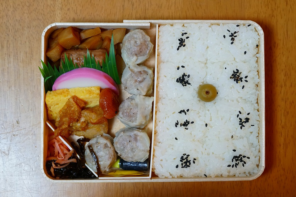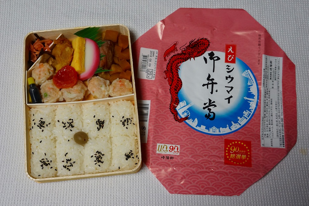 いつもより小柄な弁当箱に、絵柄を流用しながら金色に輝かせた掛紙を巻く。中身は小田原梅干の俵飯に、シウマイと特製シウマイとえびシウマイ、マグロ利休焼、蒸し鶏の彩り和え、タケノコなどの煮物、ニシン昆布巻という感じで、通常版の具の多くを少し上質にした。飛び抜けて高級にしたわけでもないので、通常版よりミニというわけでも、プレミアムというわけでもないような感じだった。