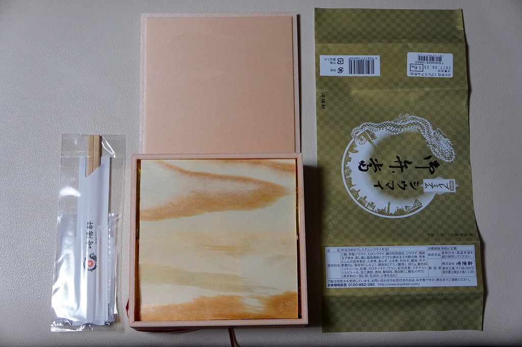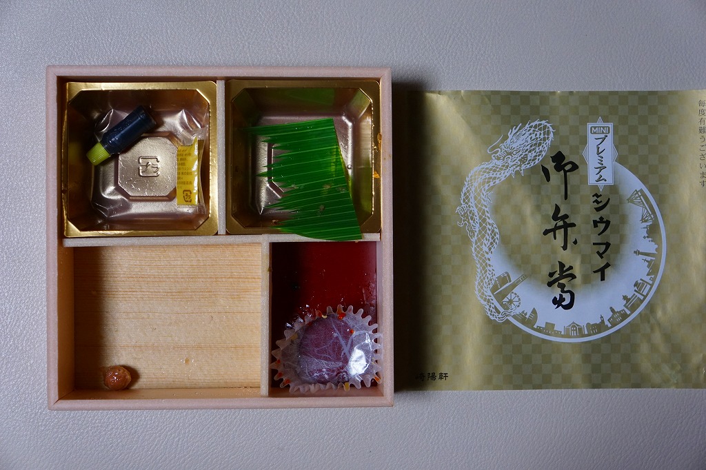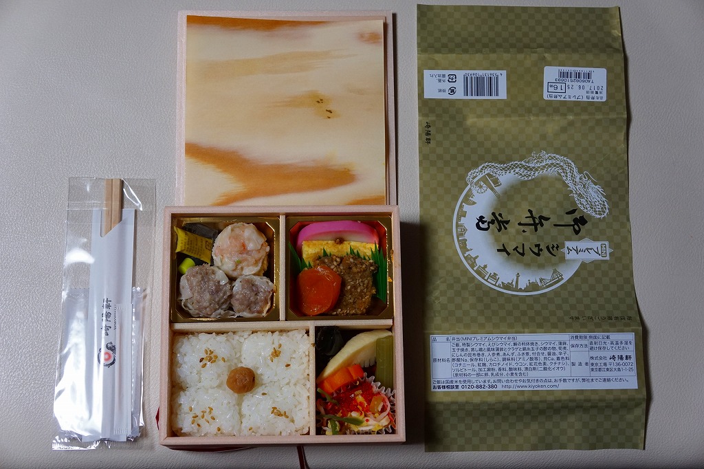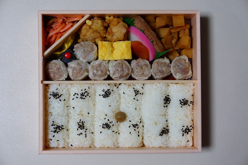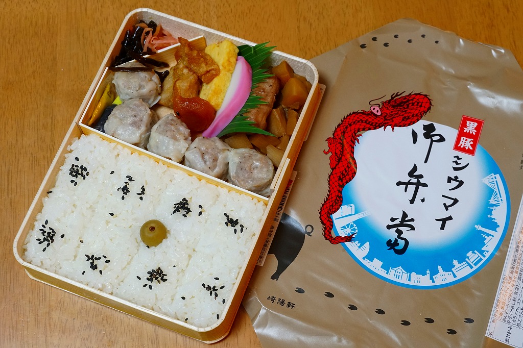 いつもより小柄な弁当箱に、絵柄を流用しながら金色に輝かせた掛紙を巻く。中身は小田原梅干の俵飯に、シウマイと特製シウマイとえびシウマイ、マグロ利休焼、蒸し鶏の彩り和え、タケノコなどの煮物、ニシン昆布巻という感じで、通常版の具の多くを少し上質にした。飛び抜けて高級にしたわけでもないので、通常版よりミニというわけでも、プレミアムというわけでもないような感じだった。