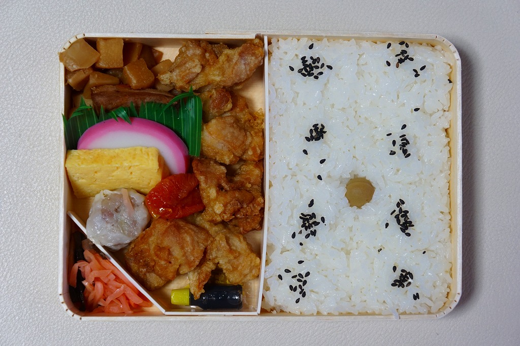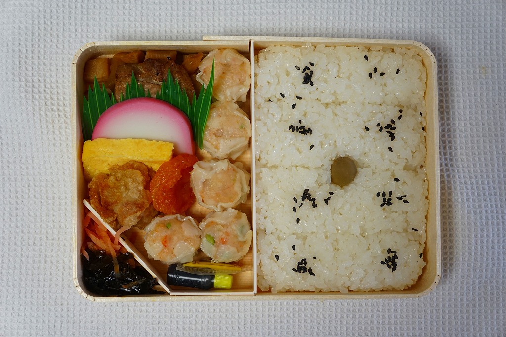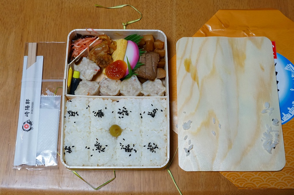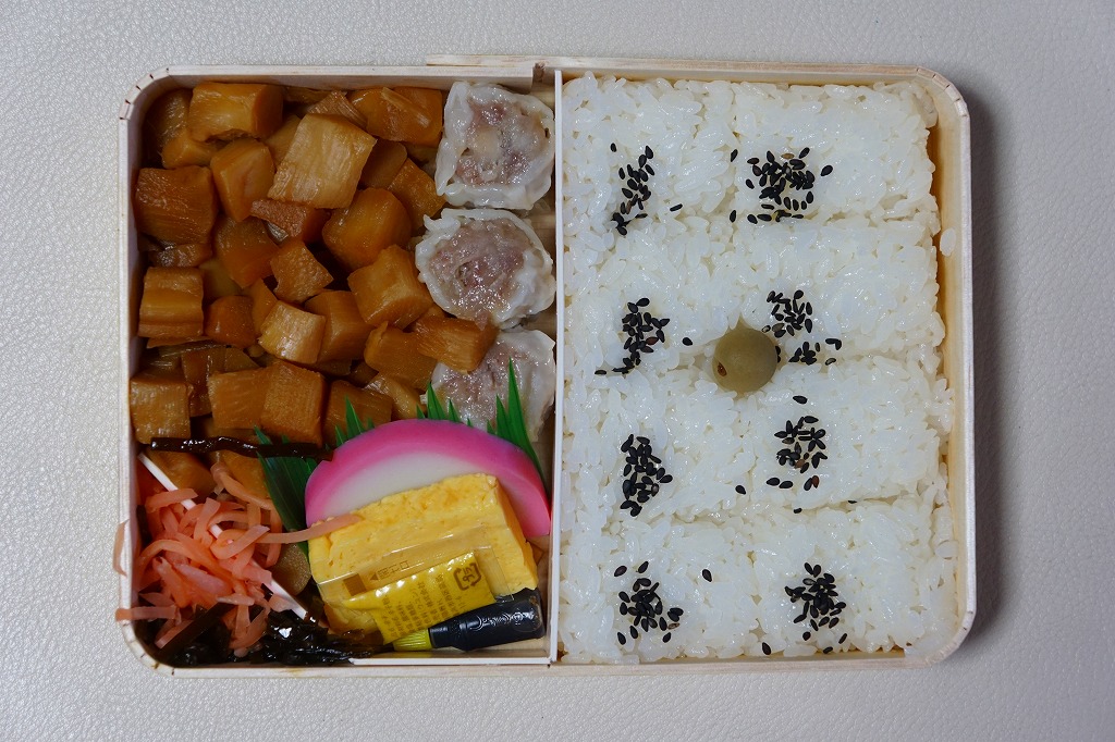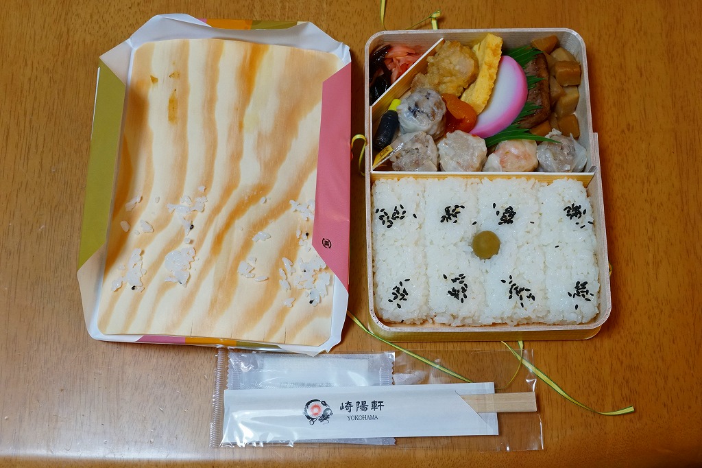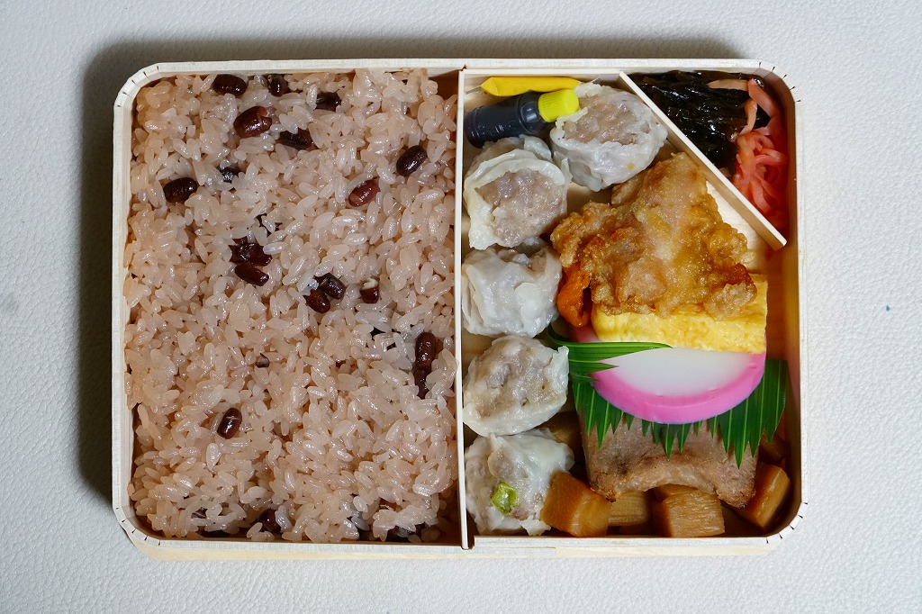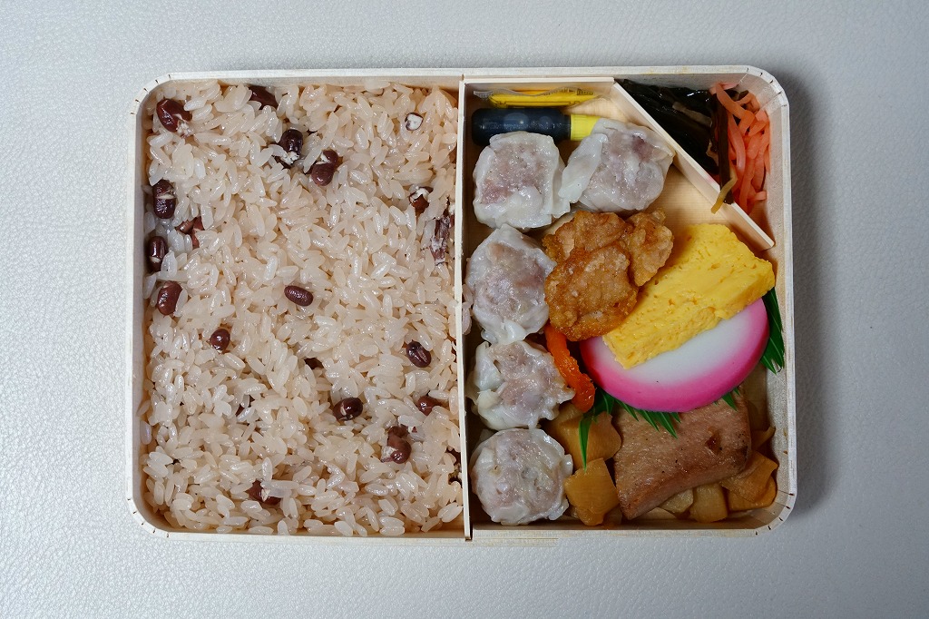 俵飯こそ日の丸ゴマ降り御飯に簡略化されているが、シウマイ5個は4個の特製シウマイに、蒲鉾は紅白各1切れに、玉子焼の厚さは3倍に、マグロ照焼の面積も2倍以上か、アンズは干さずに体積を増し、タケノコと付合せはそのまま増量、鶏唐揚に替えて鶏フライを添付し、容器の外枠と間仕切りは経木を確保した。