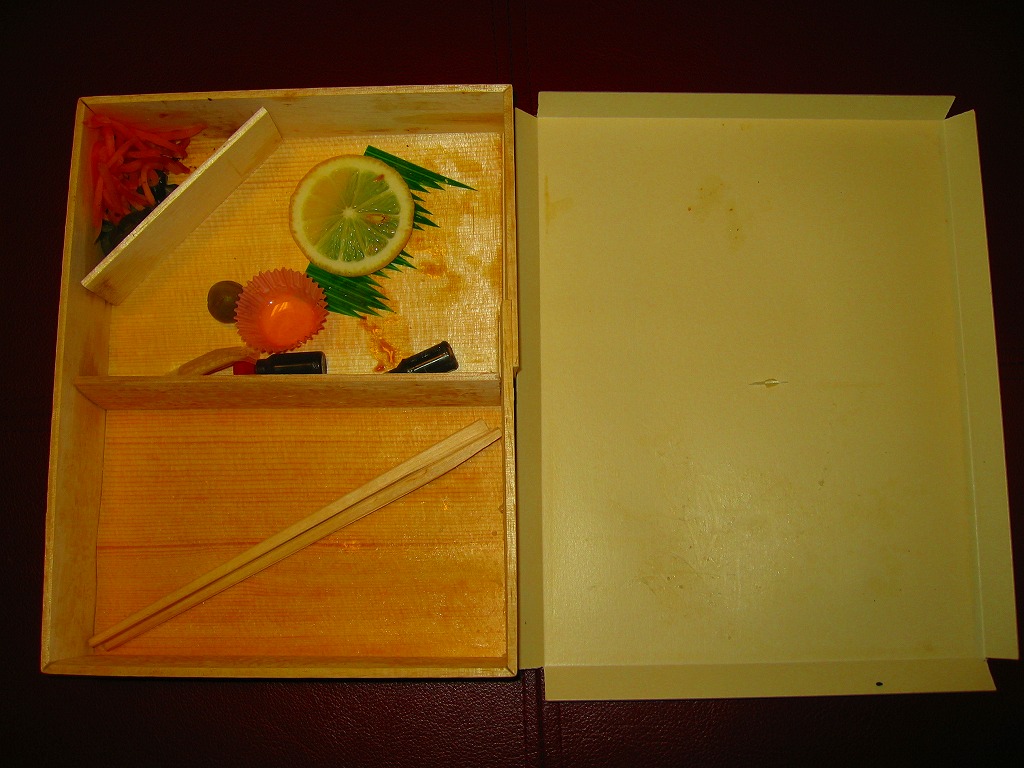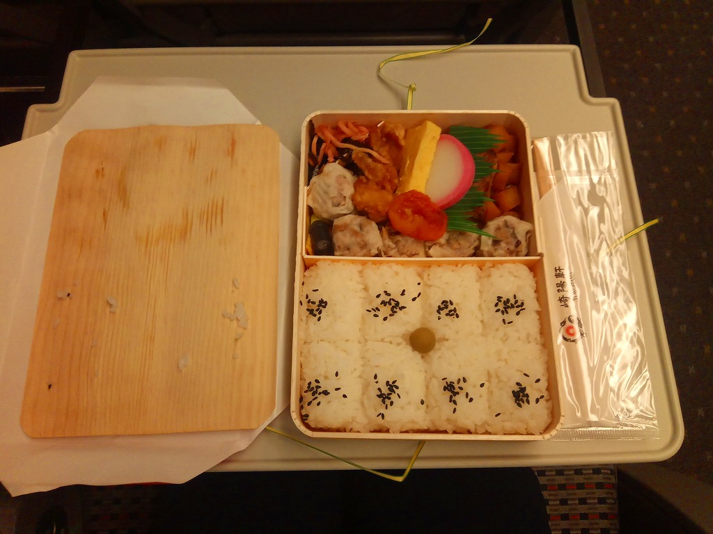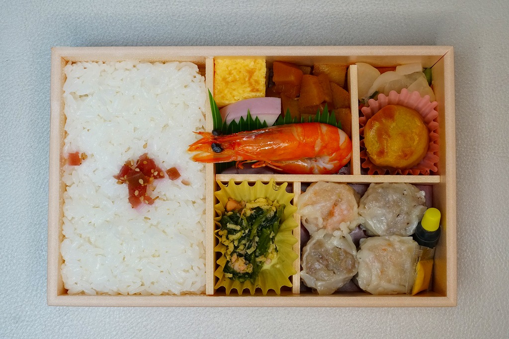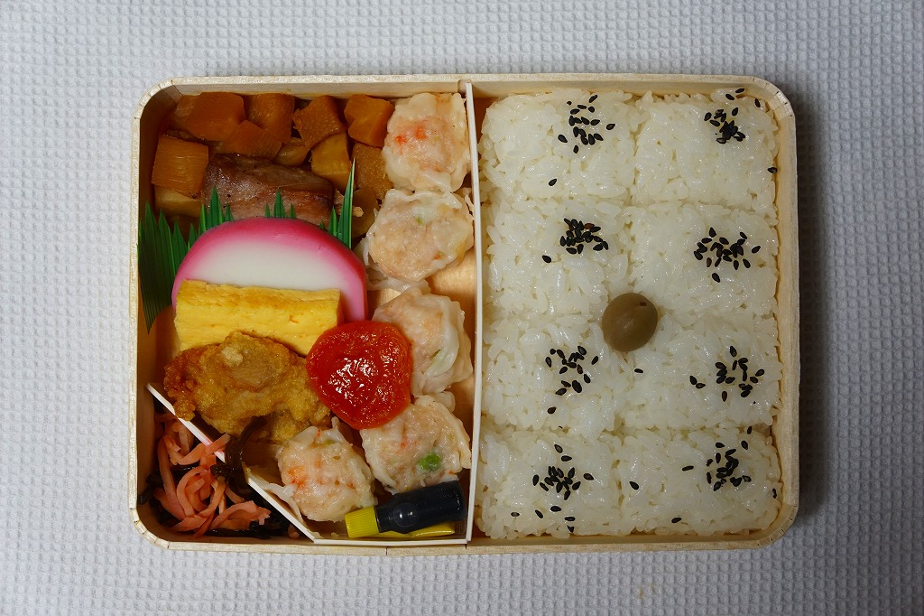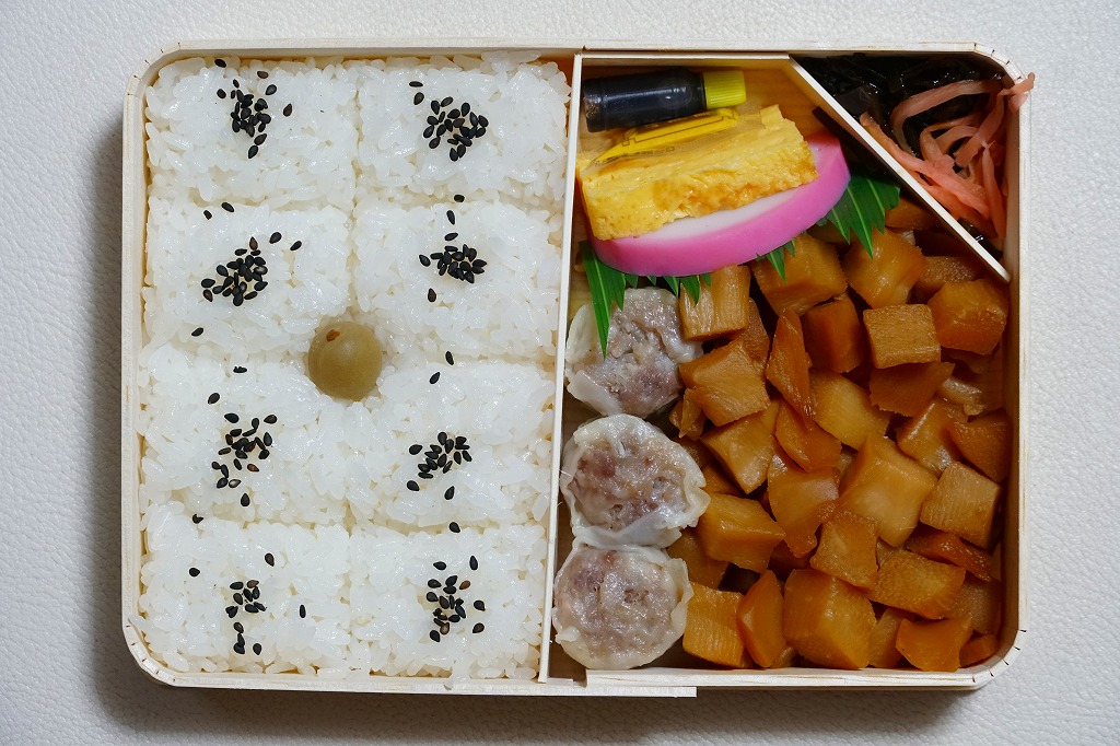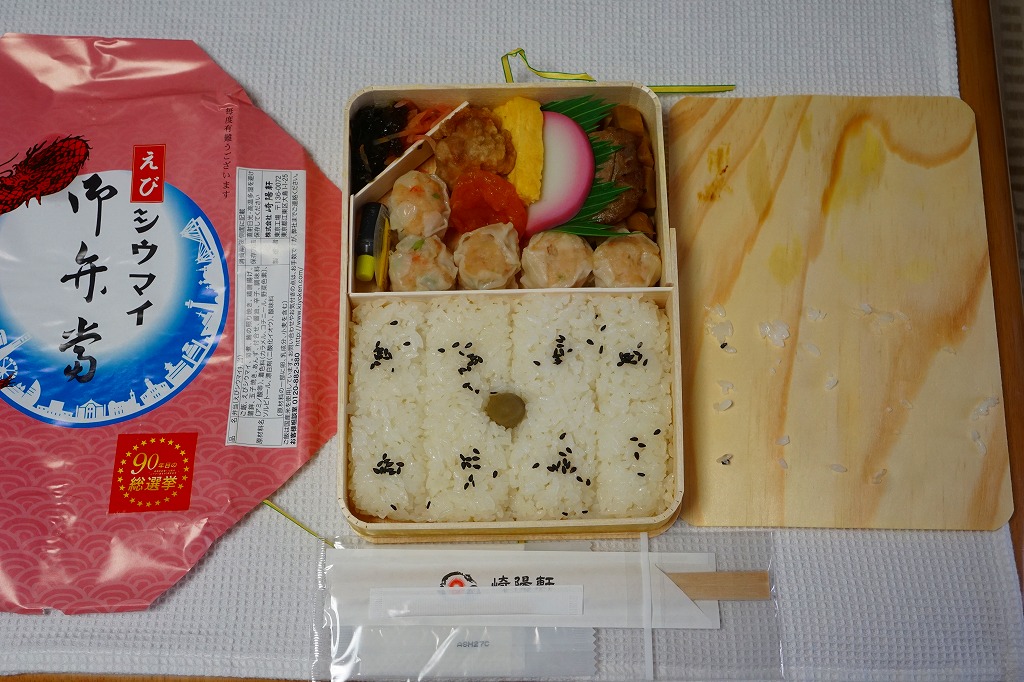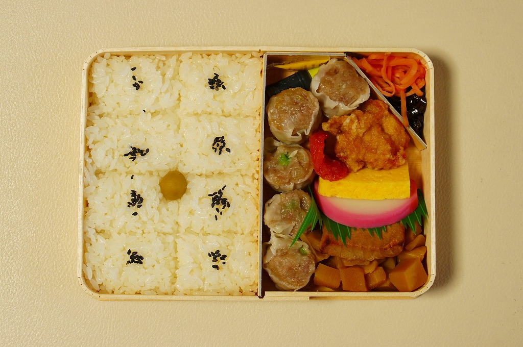 俵飯こそ日の丸ゴマ降り御飯に簡略化されているが、シウマイ5個は4個の特製シウマイに、蒲鉾は紅白各1切れに、玉子焼の厚さは3倍に、マグロ照焼の面積も2倍以上か、アンズは干さずに体積を増し、タケノコと付合せはそのまま増量、鶏唐揚に替えて鶏フライを添付し、容器の外枠と間仕切りは経木を確保した。