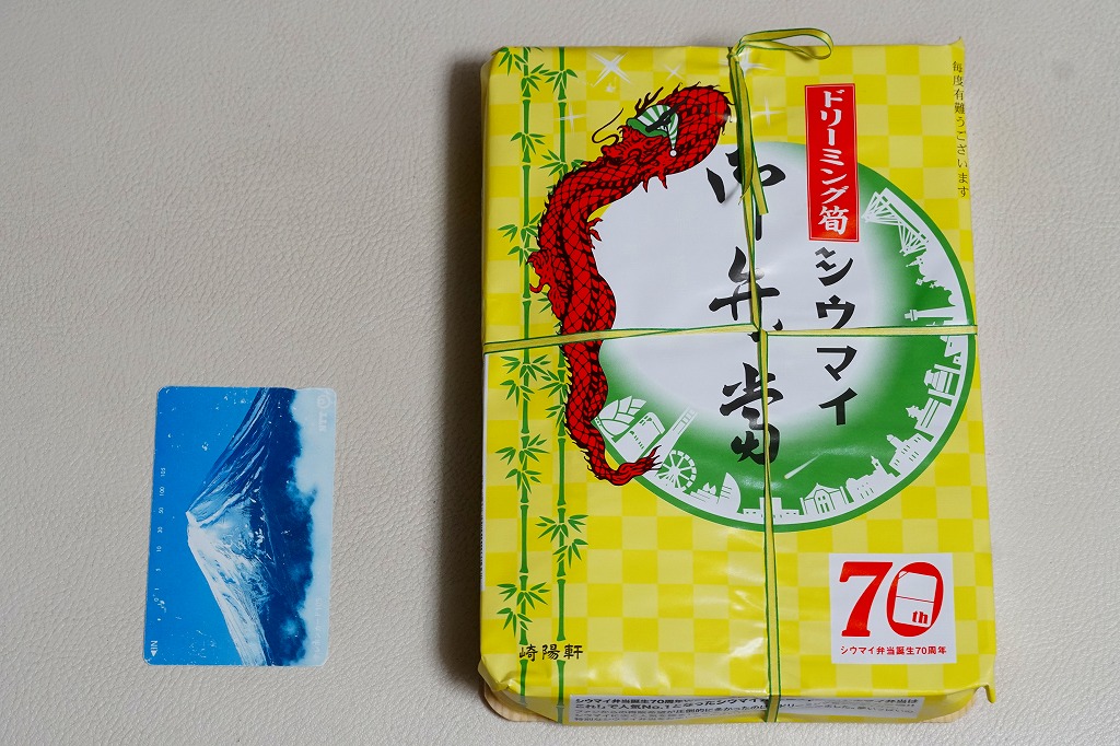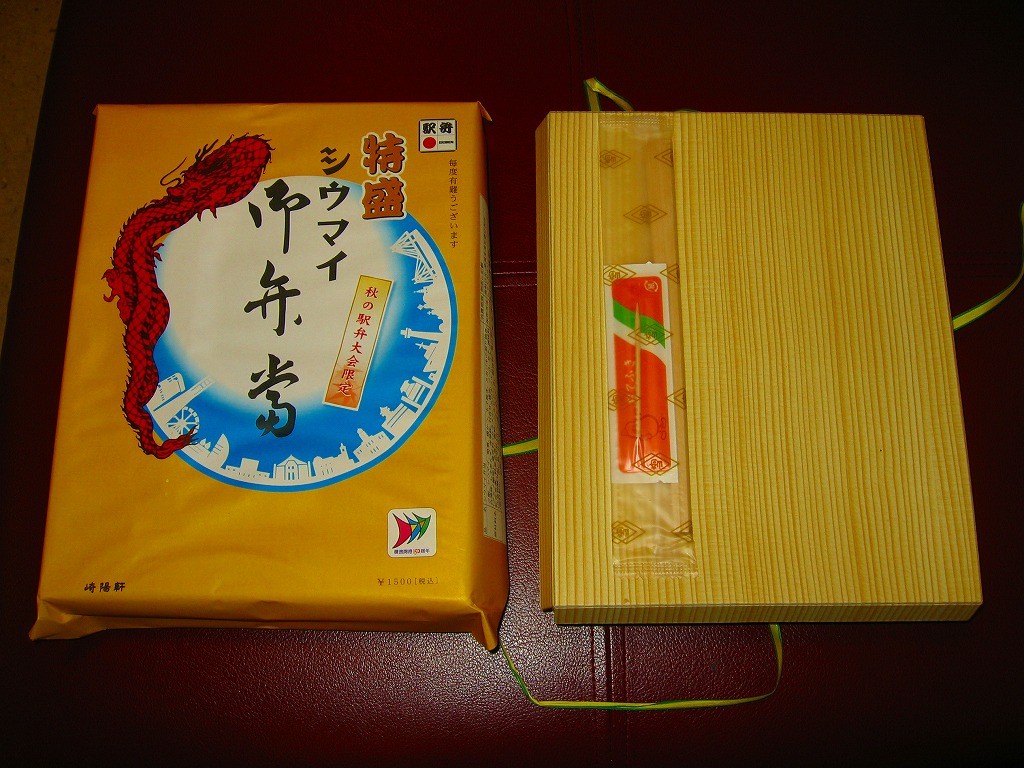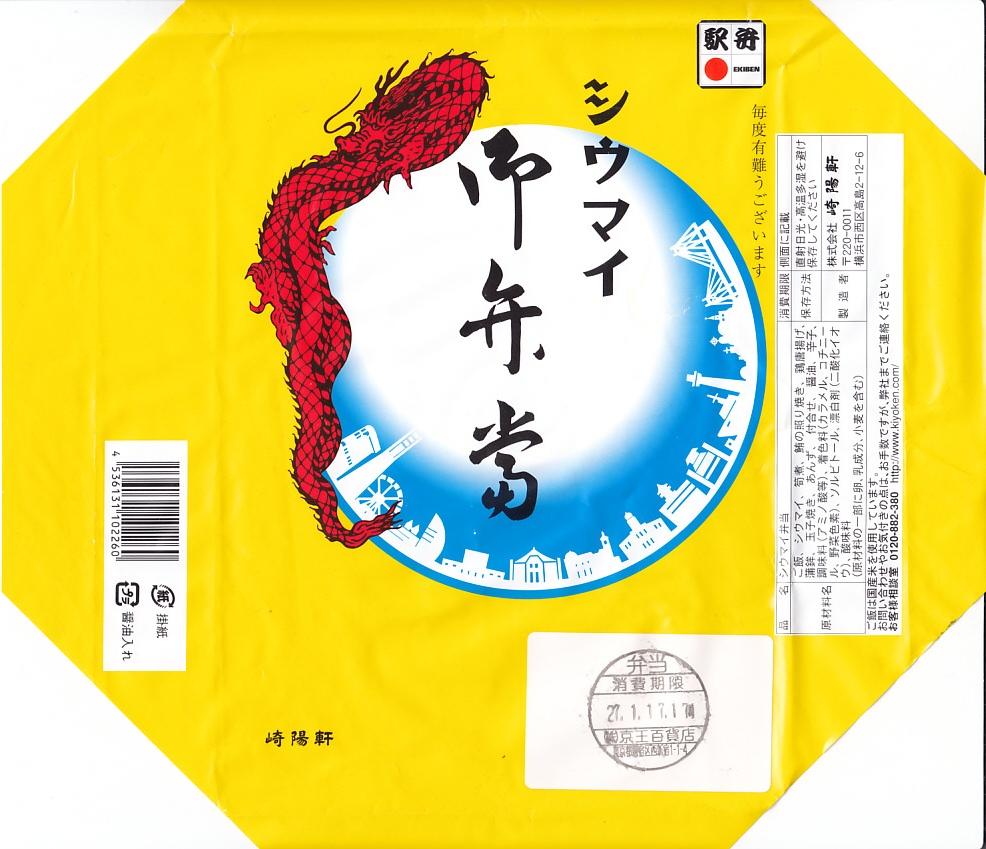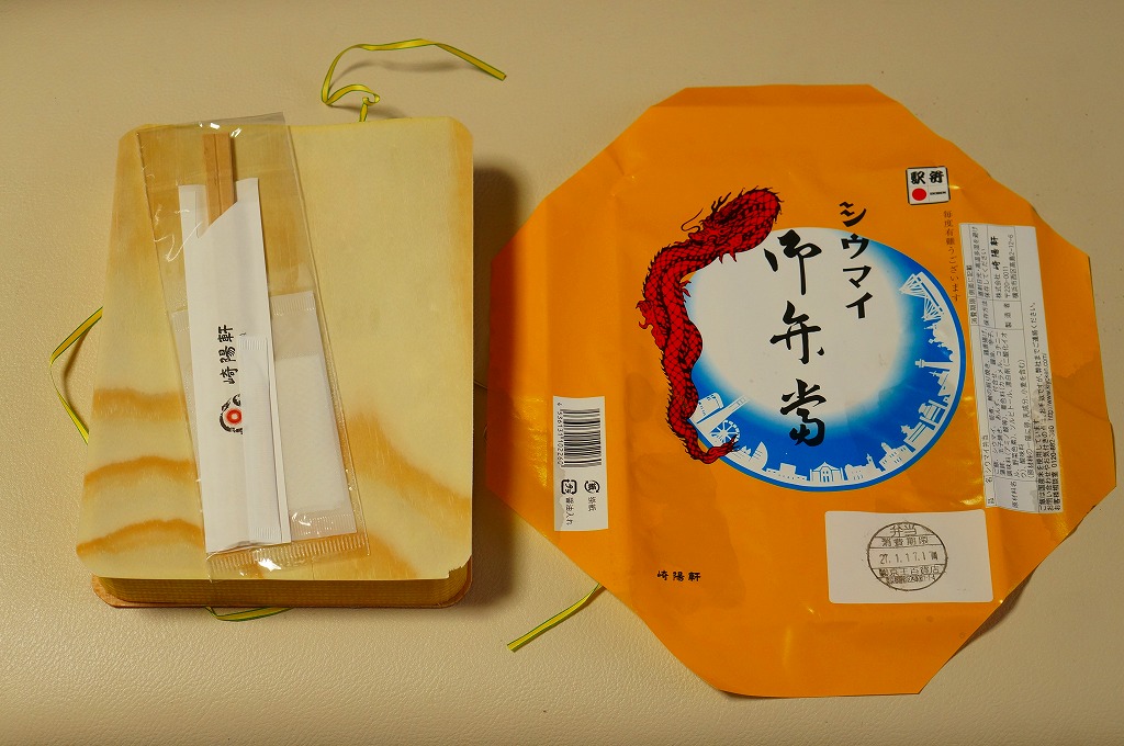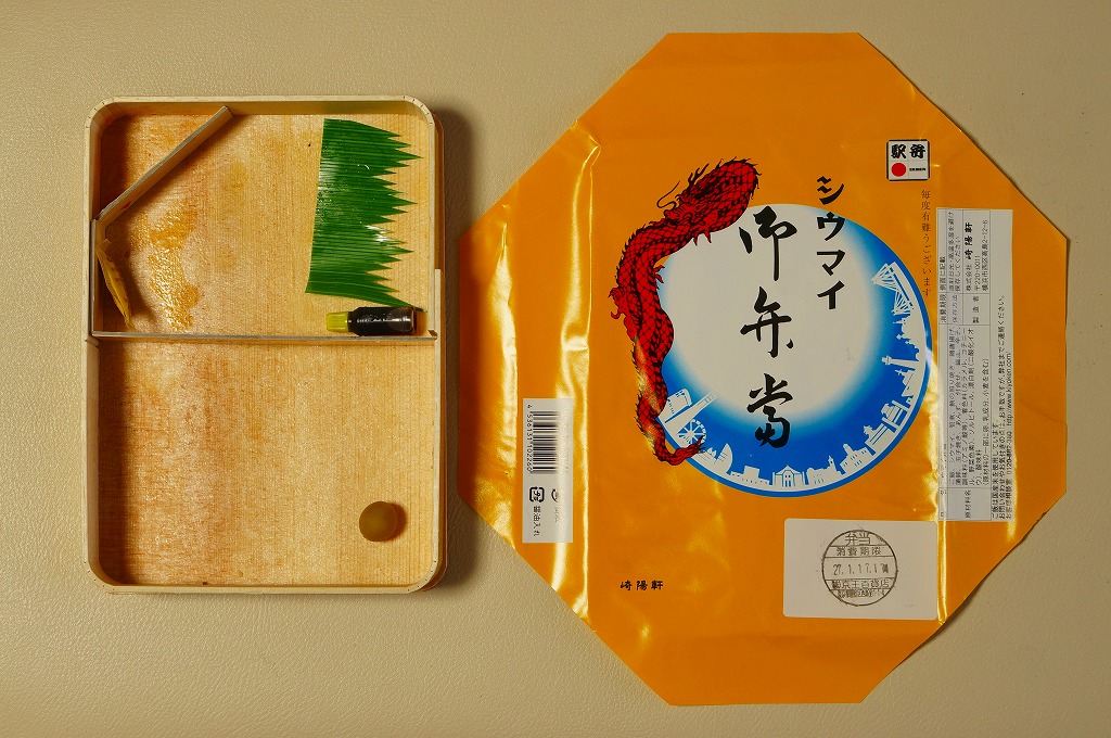 2015(平成27)年1月の、東京都新宿での京王百貨店の駅弁大会で購入した、横浜駅弁のシウマイ弁当。見た目も味も通常版と同じだが、これはデパートの催事場で実演販売されたもの。ということで、掛紙に消費期限の印字がなく、百貨店の名前で調製印が押された。
