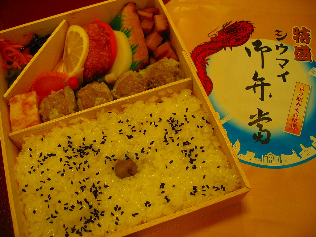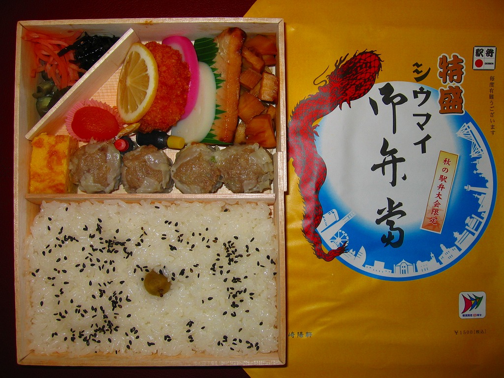2008年10月12・13日に東京駅構内で開催された「東日本縦断駅弁大会−秋−」で販売されたお弁当。メガ駅弁をテーマに、横浜駅のシウマイ弁当を拡大コピーした。横浜でも何かのイベントにつけて限定販売すれば、少なくとも神奈川新聞の記事とTVKのニュースになるはず。