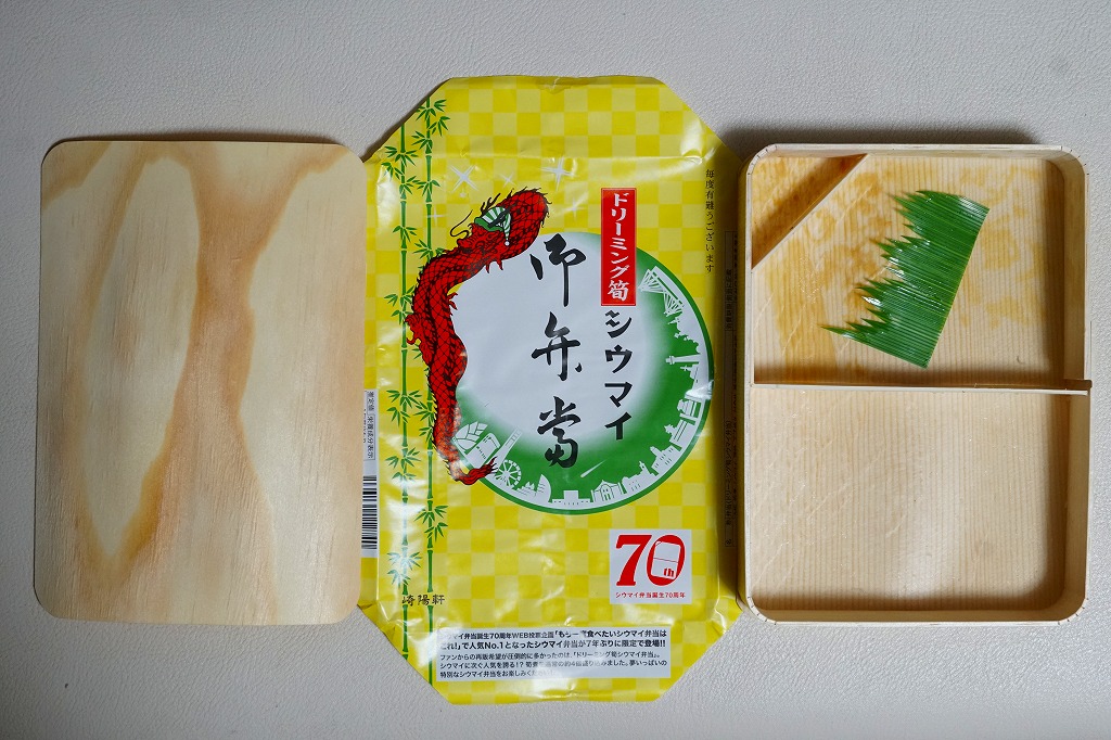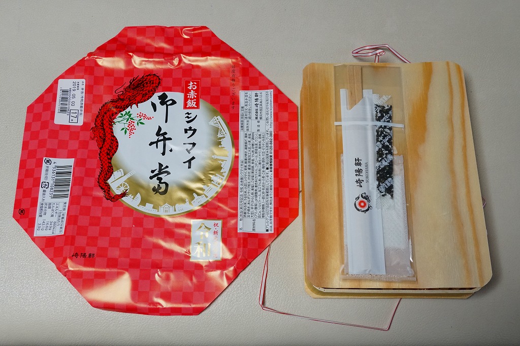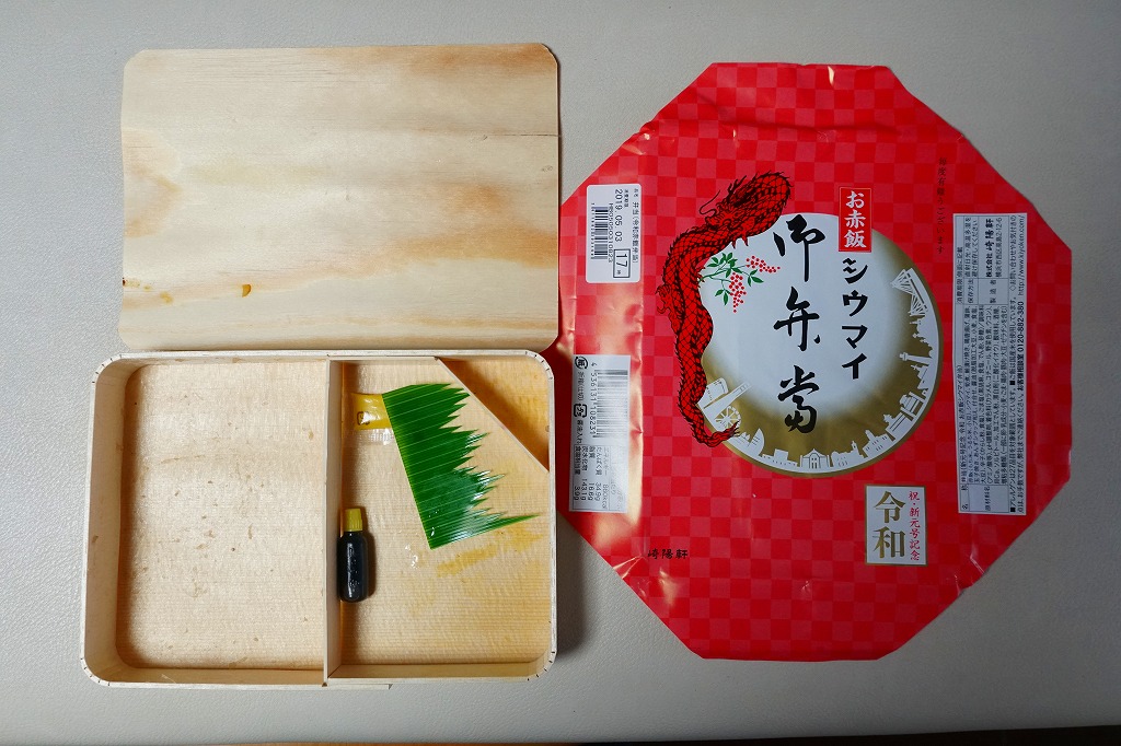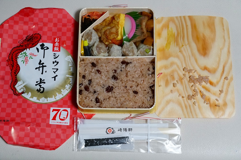 過去に東京で復刻されたものと同じく、普段の経木折を初代の絵柄を持つ掛紙で包み、いつもどおりひもでしばる。その復刻掛紙の価格表示に、今回の値段を書き入れた。中身は日の丸俵飯に玉子焼、筍煮、ブリ照焼、海老フライ、かまぼこ、セロリの浅漬け、福神漬、昔ながらのシウマイ4個。普段のシウマイ弁当より、150円高かった。