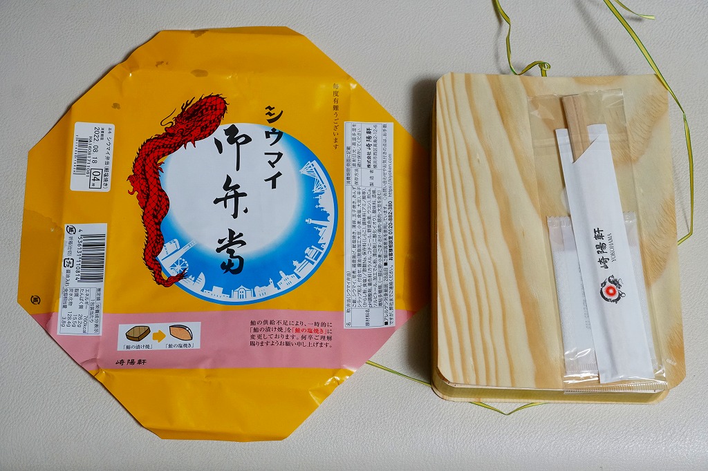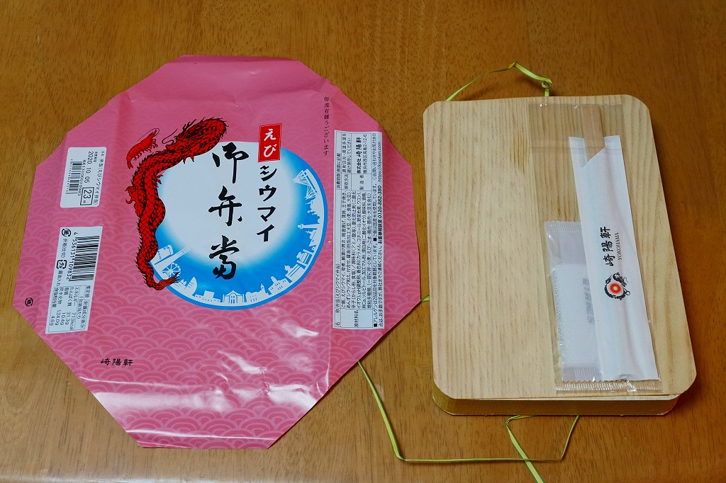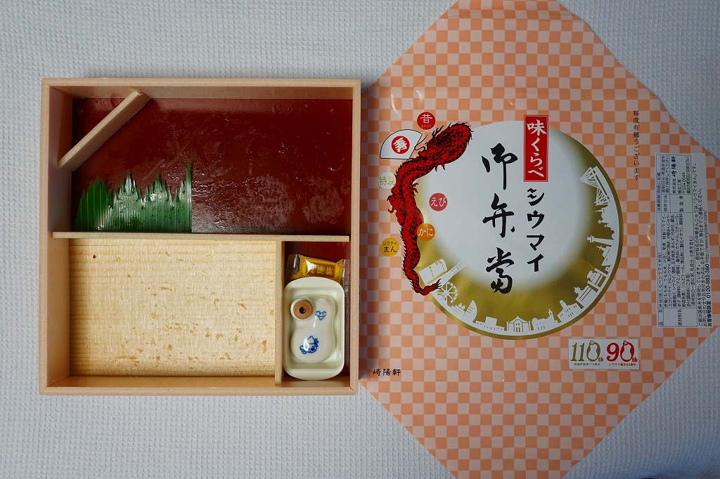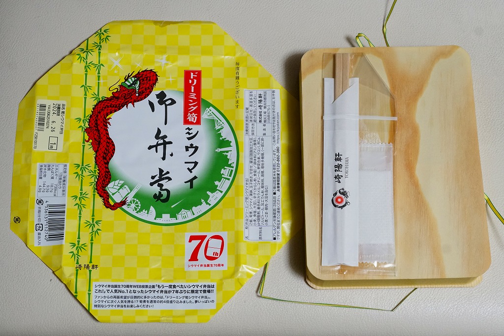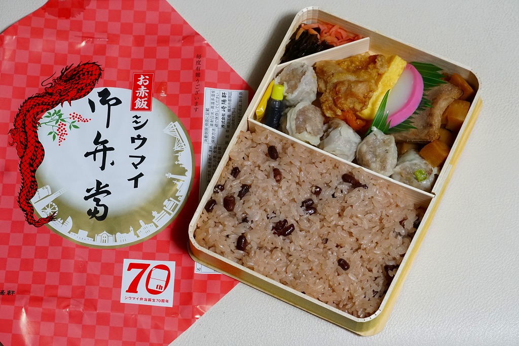過去に東京で復刻されたものと同じく、普段の経木折を初代の絵柄を持つ掛紙で包み、いつもどおりひもでしばる。その復刻掛紙の価格表示に、今回の値段を書き入れた。中身は日の丸俵飯に玉子焼、筍煮、ブリ照焼、海老フライ、かまぼこ、セロリの浅漬け、福神漬、昔ながらのシウマイ4個。普段のシウマイ弁当より、150円高かった。