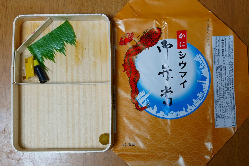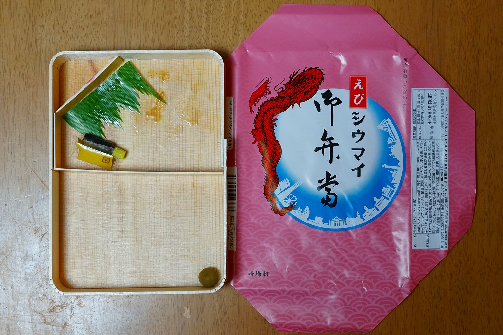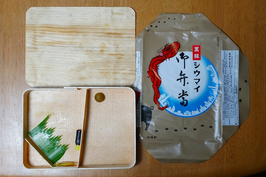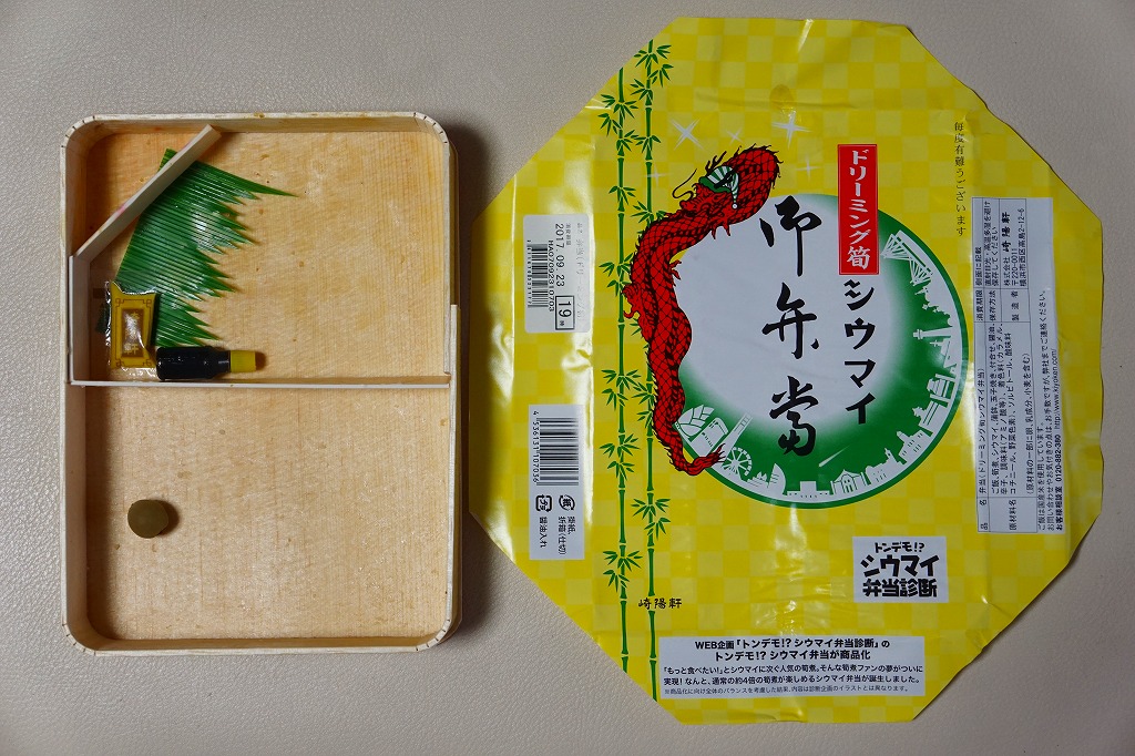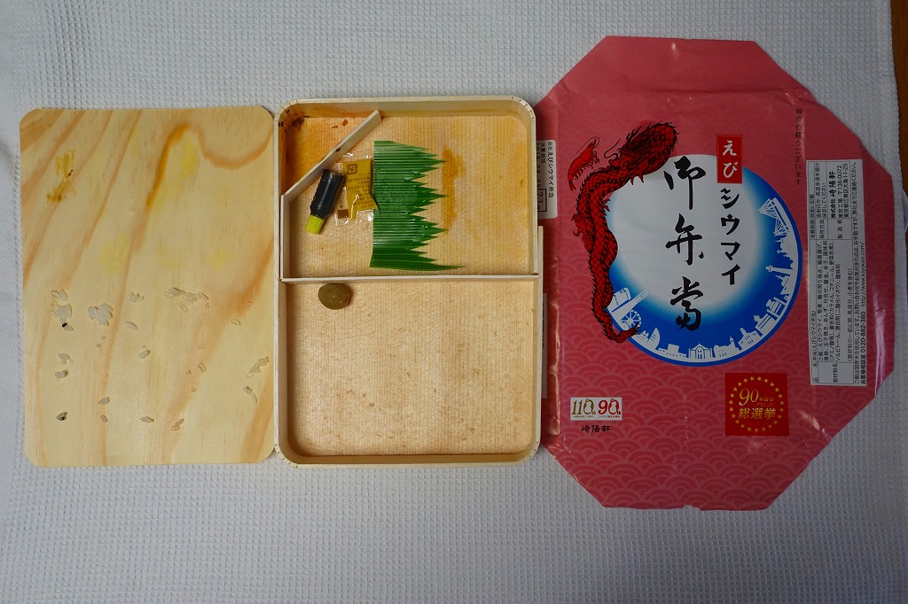 容器と掛紙とひもの幅を、1.5倍くらいに拡大した感じ。中身も俵飯を8個から12個に、シウマイを5個から8個に、マグロ照焼を1.5倍大に、鶏唐揚を1個から2個に、玉子焼の厚さを2倍に、タケノコ煮の分量を1.5倍に、切り昆布と千切り生姜を2倍にしたという。分量以外は通常版と同じなので、味もまったく同じ。容器は経木折とならなかったものの、内ふたと飯の底に経木を使っていた。
