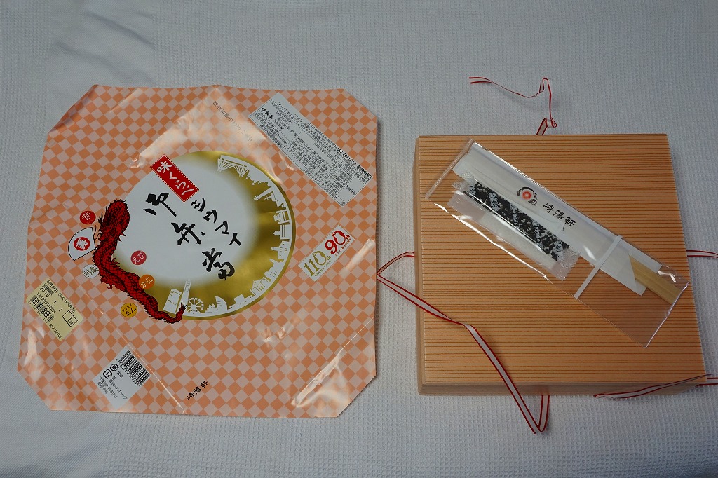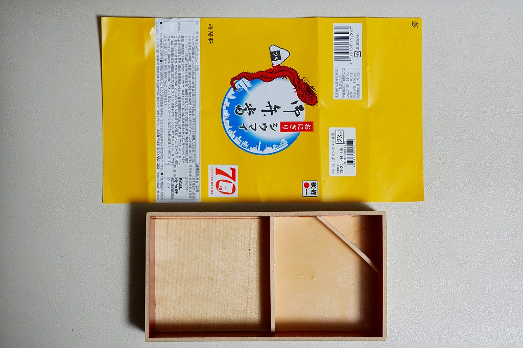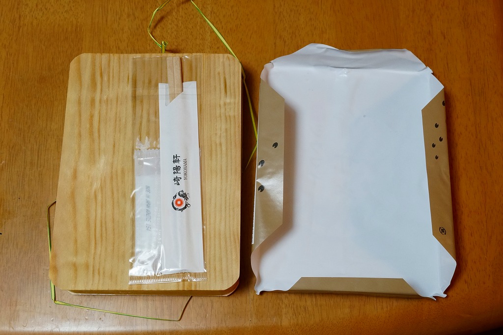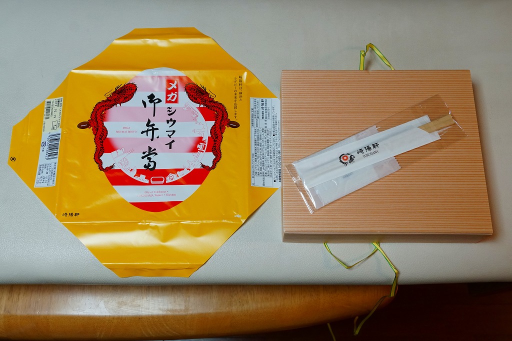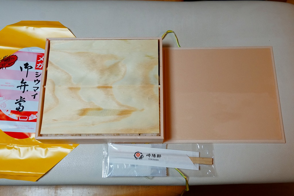 容器と掛紙とひもの幅を、1.5倍くらいに拡大した感じ。中身も俵飯を8個から12個に、シウマイを5個から8個に、マグロ照焼を1.5倍大に、鶏唐揚を1個から2個に、玉子焼の厚さを2倍に、タケノコ煮の分量を1.5倍に、切り昆布と千切り生姜を2倍にしたという。分量以外は通常版と同じなので、味もまったく同じ。容器は経木折とならなかったものの、内ふたと飯の底に経木を使っていた。