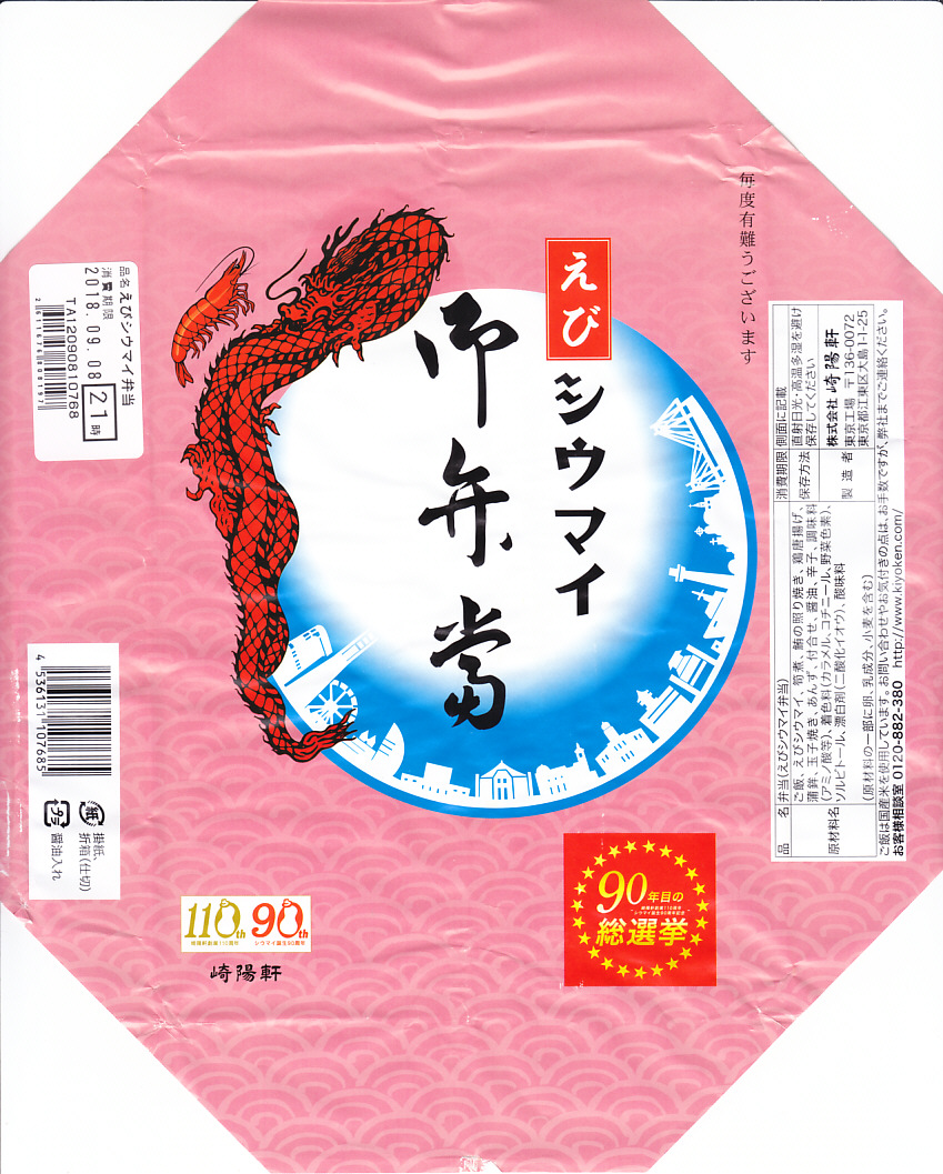 2018(平成30)年9月7日から13日まで販売。同年7月に調製元が自社公式サイト内で実施した人気投票企画「崎陽軒 創業110周年・シウマイ誕生90周年記念 90年目の総選挙」で、「昔ながらのシウマイ」に次ぎ投票数が多かった「えびシウマイ」を、期間限定でシウマイ弁当にした。