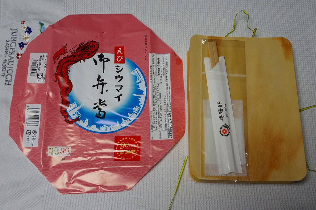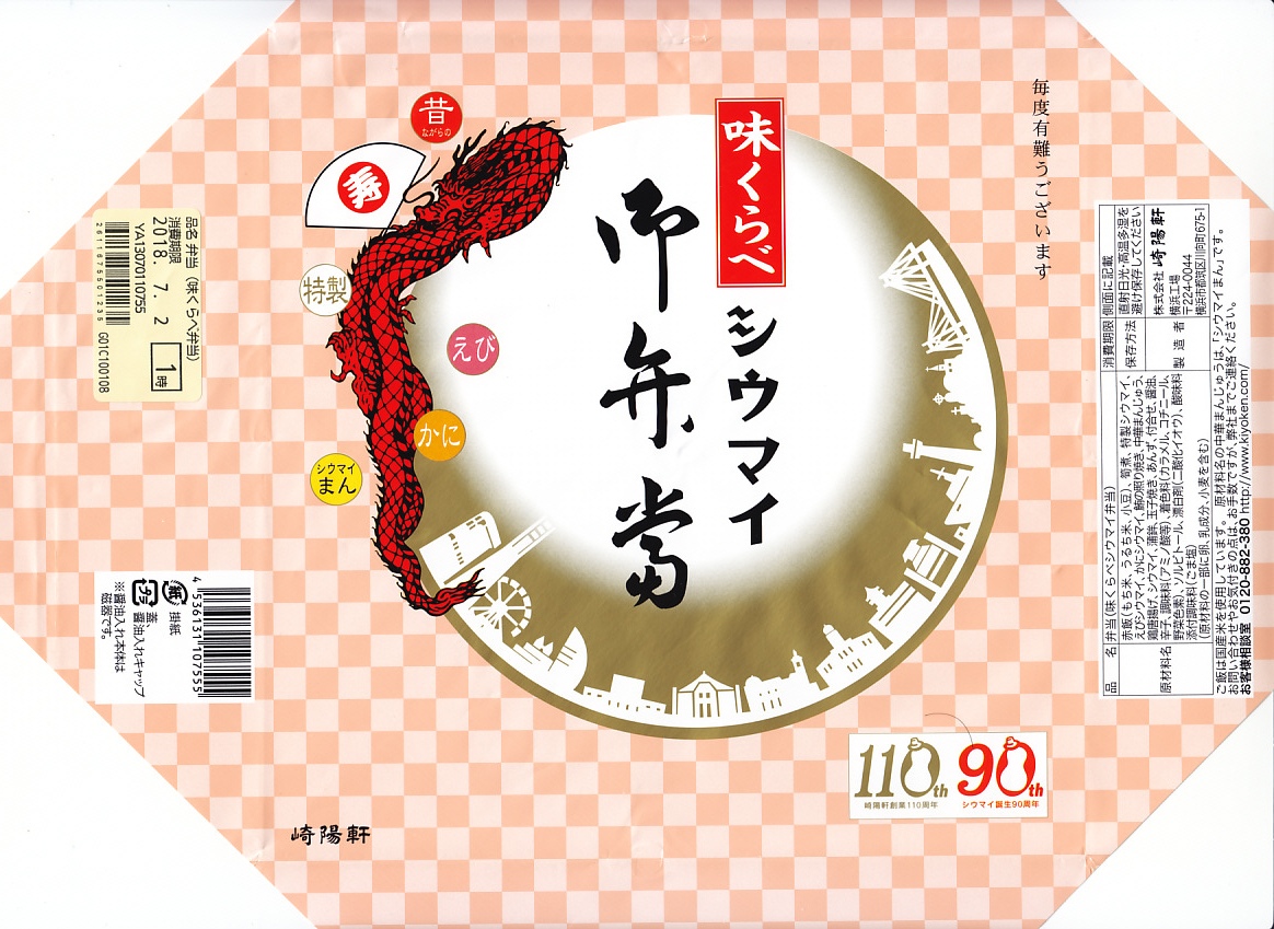 2018(平成30)年9月8日に購入した、横浜駅弁の掛紙。上の「えびシウマイ御弁當」との違いは、製造者が横浜の崎陽軒か東京工場かの違いだけ。通常版のシウマイ弁当では、横浜製のものは経木折に掛紙をかけてひもで十字にしばり、東京製のものはボール紙のふたをしてフィルムで留める。今回の期間限定駅弁では、東京製も横浜と同じく、掛紙を使用していたので驚いた。駅弁と崎陽軒の上級者にしか分からない違い。