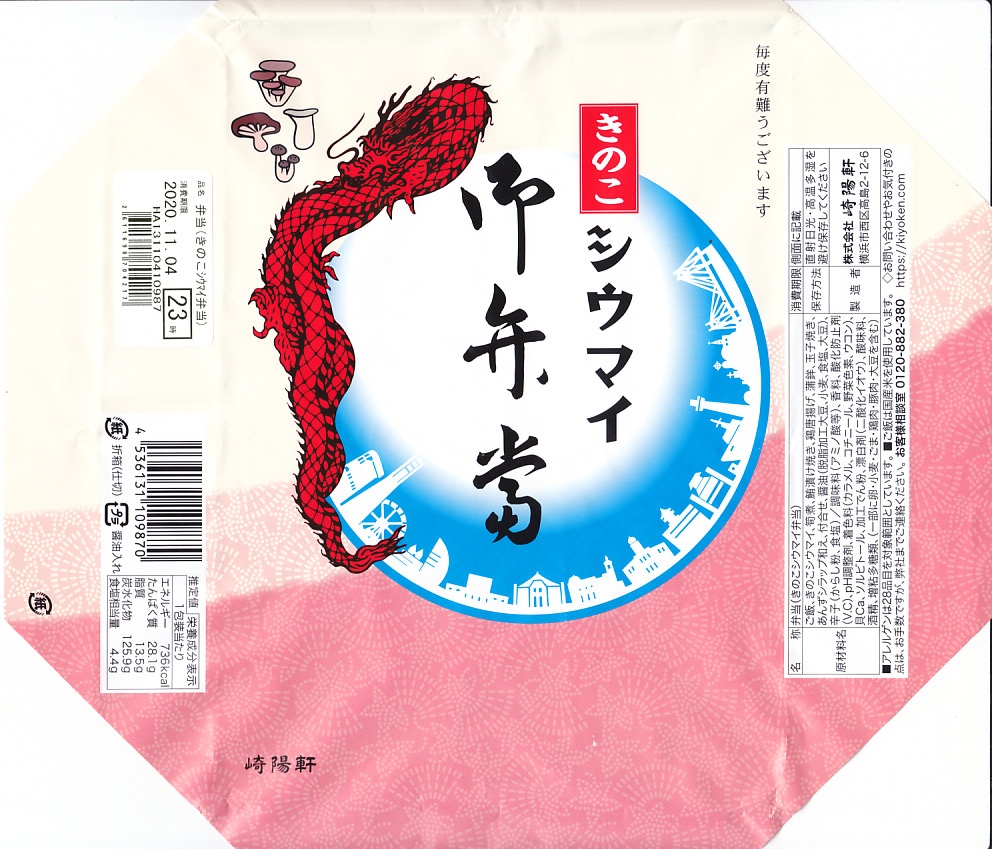 崎陽軒の「次の主役は誰だ!2020 シウマイ弁当リレー企画」による商品の第4弾として、2020(令和2)年11月1日から10日まで販売。普段の横浜駅弁のシウマイ弁当について、シウマイ5個を同じ大きさの「きのこシウマイ」に差し替えて、掛紙の絵柄を少し変えて販売した。えび、かに、黒豚、きのこと、この企画をすべて追いかけてきて、弁当の御飯に合うのはやっぱり普段のシウマイであることを改めて感じた。東京エリアでも販売。